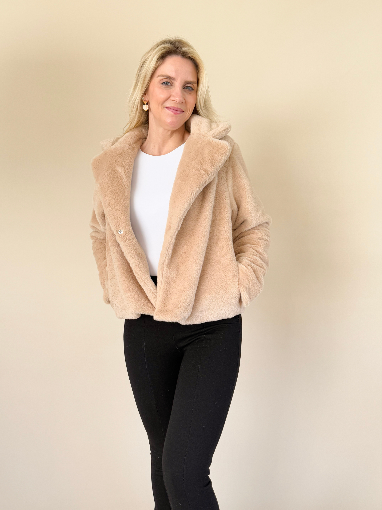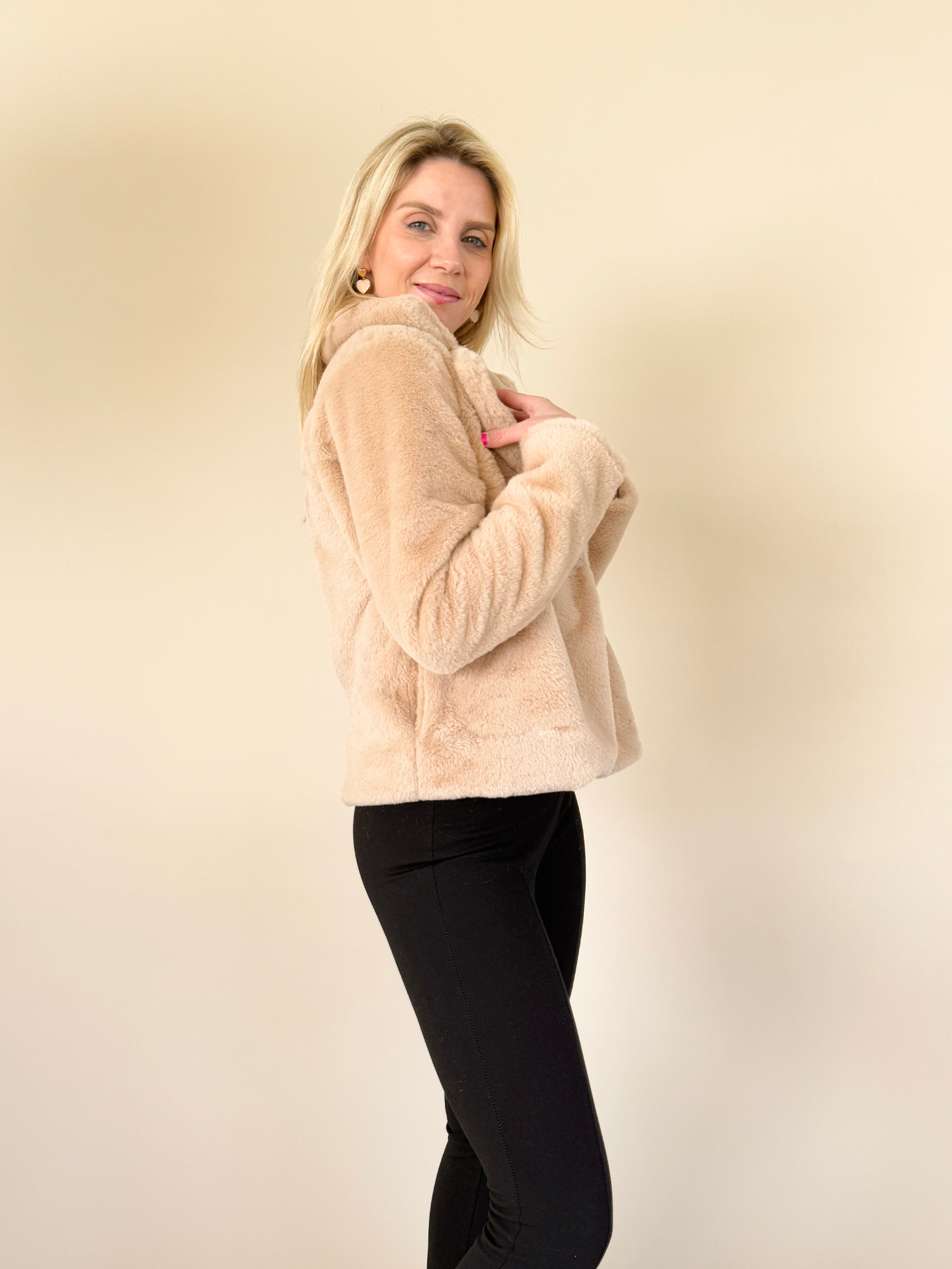 Abrigo corto de piel es una prenda única, confeccionada en 100% poliester, que aporta estilo y comodidad en igual medida. Pensada para adaptarse a diferentes ocasiones, su diseño permite múltiples combinaciones para crear looks modernos y femeninos.
