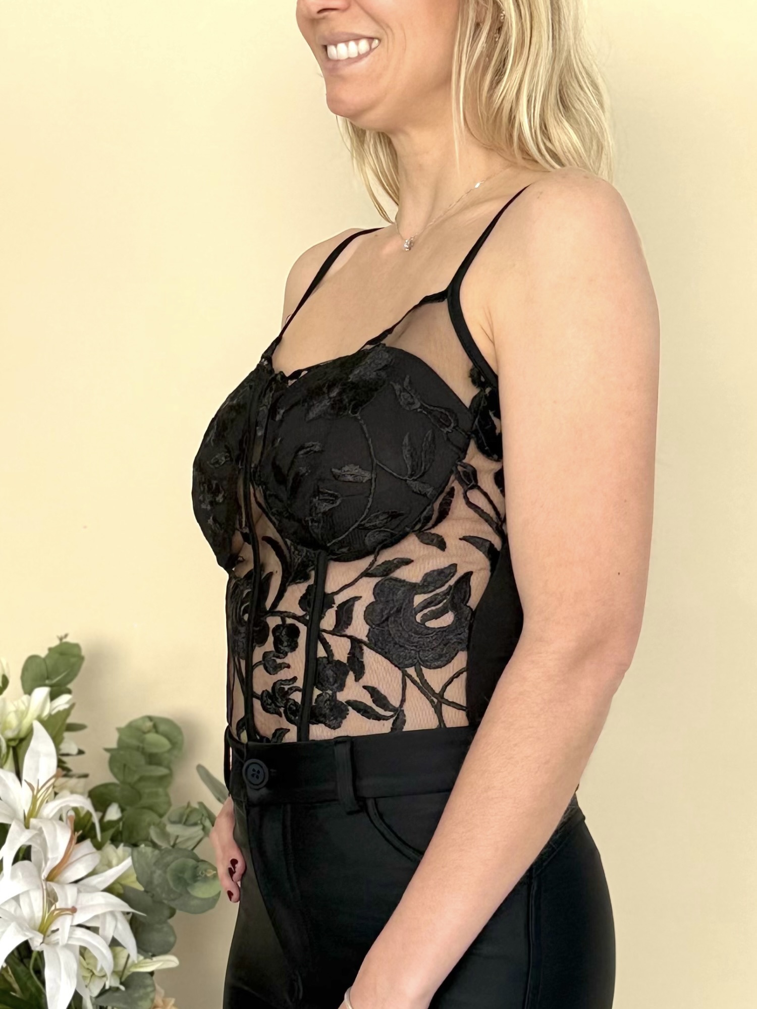 El Body de encaje con flores y mesh es una prenda diseñada para resaltar la feminidad con sutileza y elegancia. Su combinación de encaje delicado con diseño de flores y paneles en mesh translúcido crea un equilibrio perfecto entre sensualidad y sofisticación. El ajuste preciso realza la figura con suavidad, mientras que sus acabados finos y texturas contrastantes aportan un aire refinado y contemporáneo.