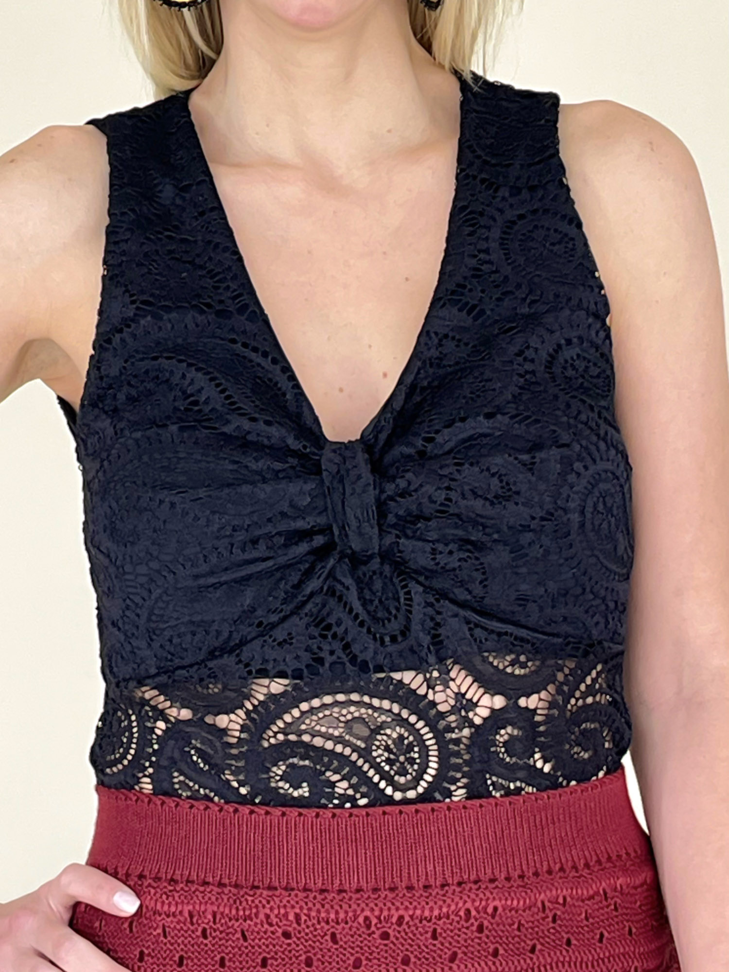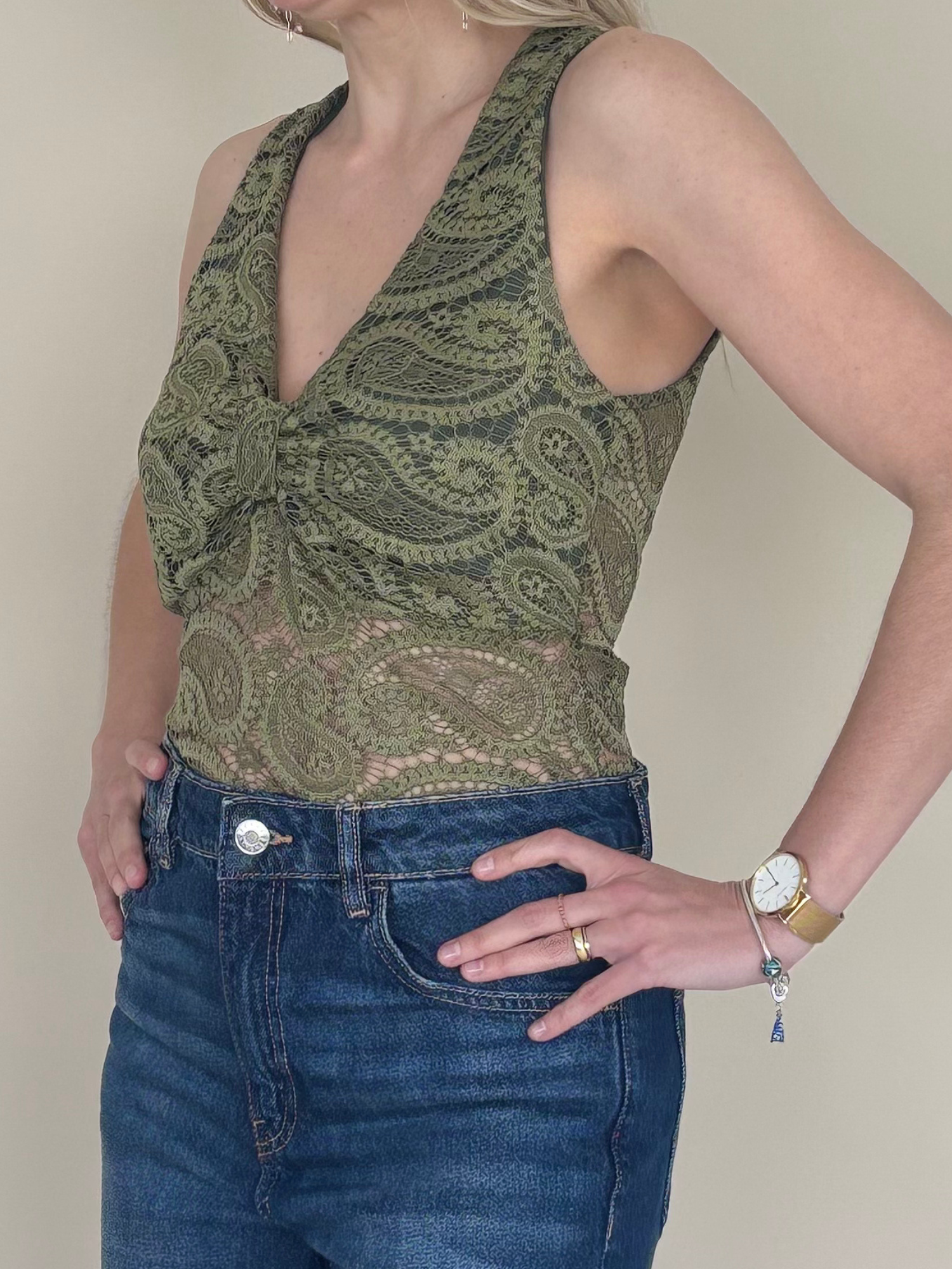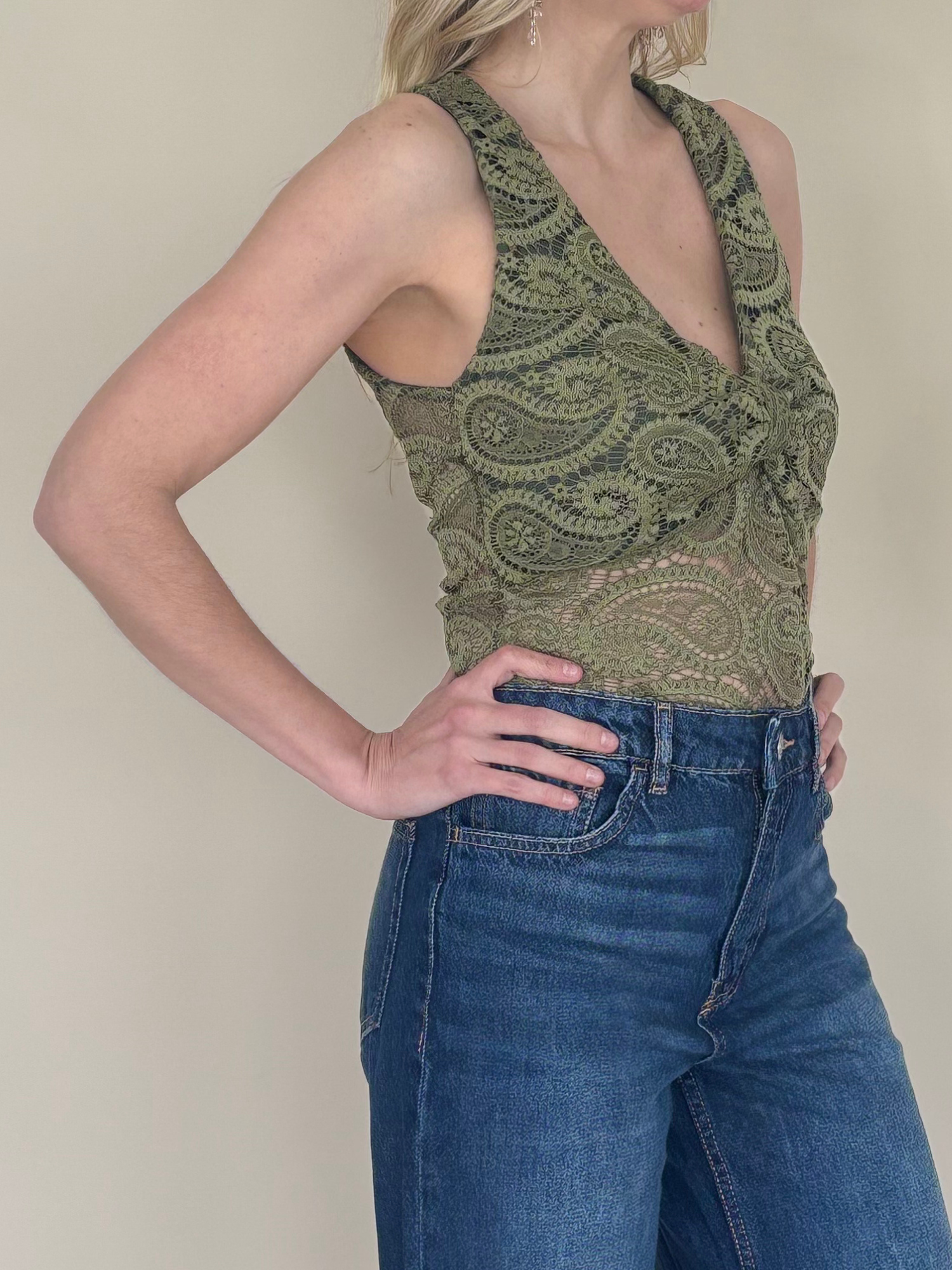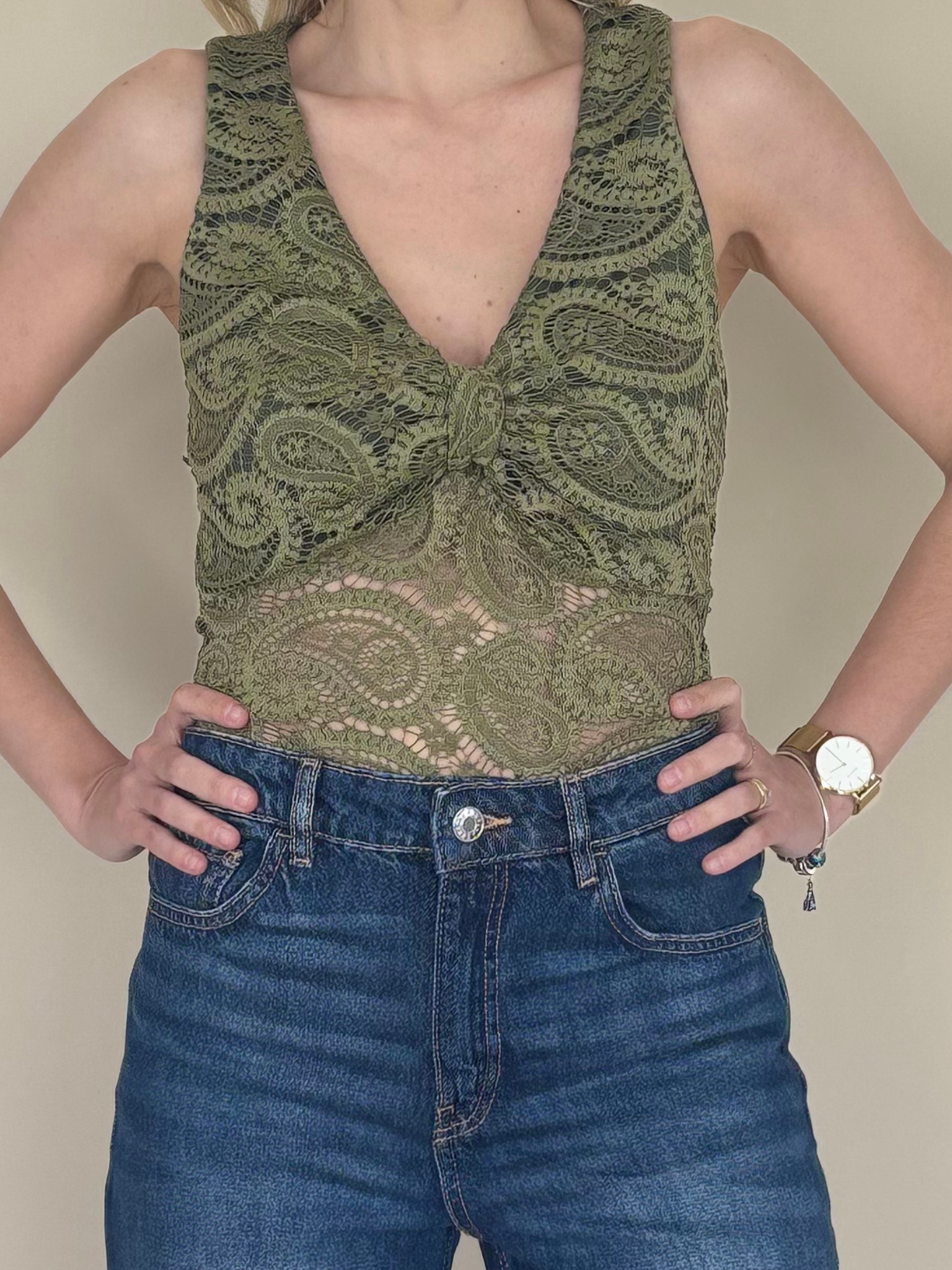 El Body de encaje con escote en V es una prenda que combina sensualidad y sofisticación en un diseño atemporal. Su delicado encaje realza la feminidad con transparencias sutiles, mientras que el escote profundo en V estiliza y aporta un aire elegante y seductor. El diseño sin mangas equilibra frescura y comodidad, logrando una pieza versátil que se adapta tanto a ocasiones especiales como a looks más urbanos con un toque chic.