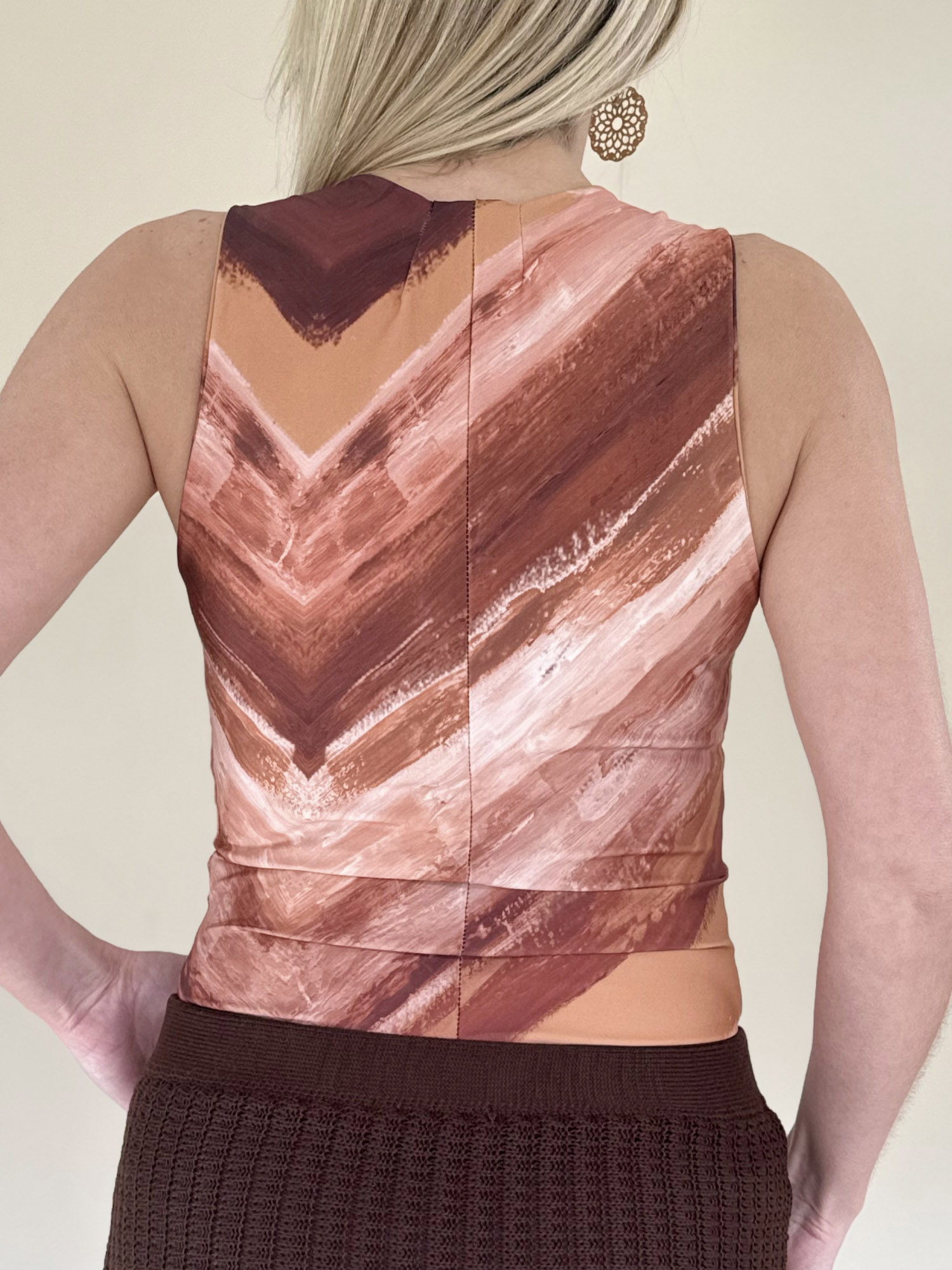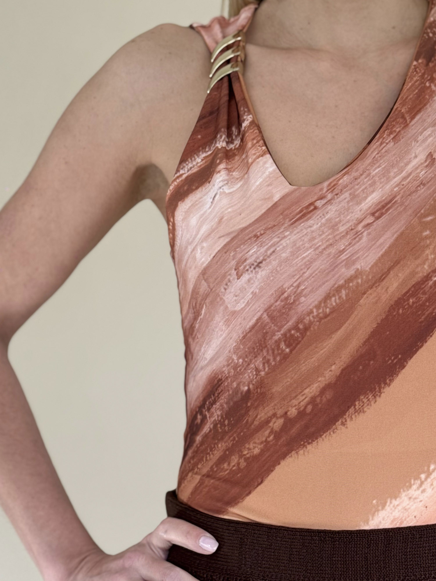 El Body sin mangas diseño Dunas es una pieza moderna y elegante que realza la silueta con sutileza. Su diseño inspirado en las formas ondulantes de las dunas aporta textura y dinamismo, convirtiéndolo en un básico sofisticado con un aire contemporáneo. La ausencia de mangas ofrece frescura y versatilidad, perfecto para crear looks tanto de día como de noche.