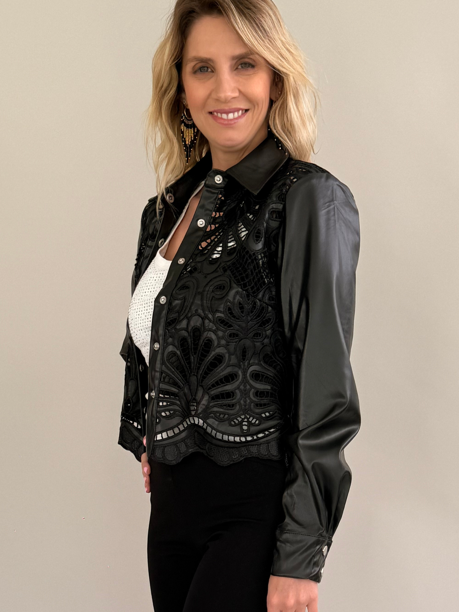 Tip de estilo: Llévala sobre una blusa blanca o un top ajustado con pantalones de corte recto o jeans oscuros para un look urbano con un toque sofisticado. También puedes combinarla con una falda midi o vestido ceñido para crear un contraste entre fuerza y delicadeza. La Chaqueta Sobrecamisa de ecocuero con encaje floral refleja la esencia de Casale & Co.: elegancia moderna, estilo refinado y detalles que marcan la diferencia.