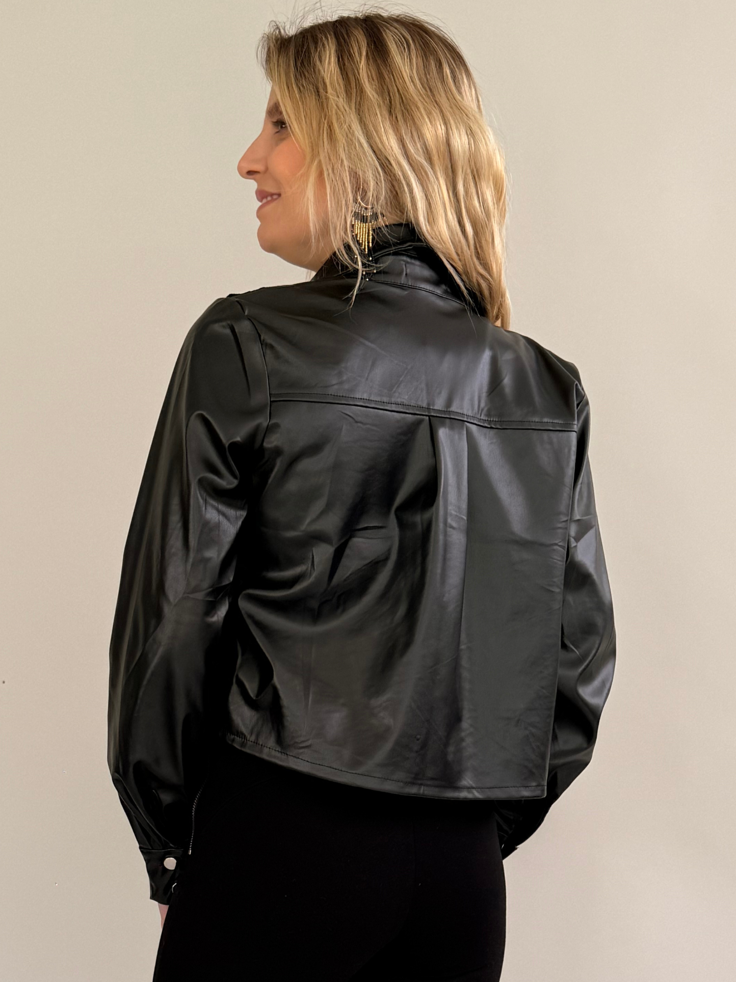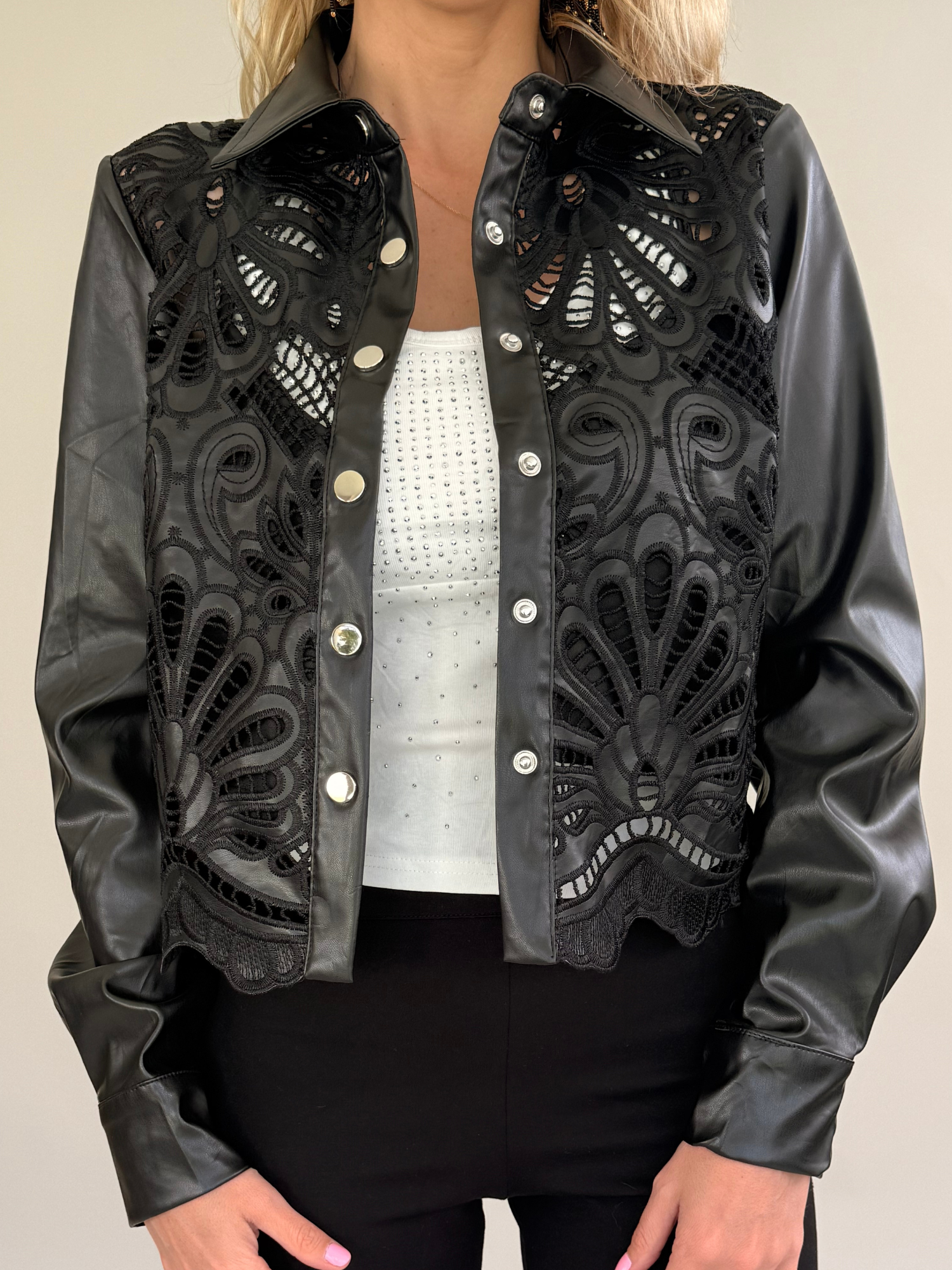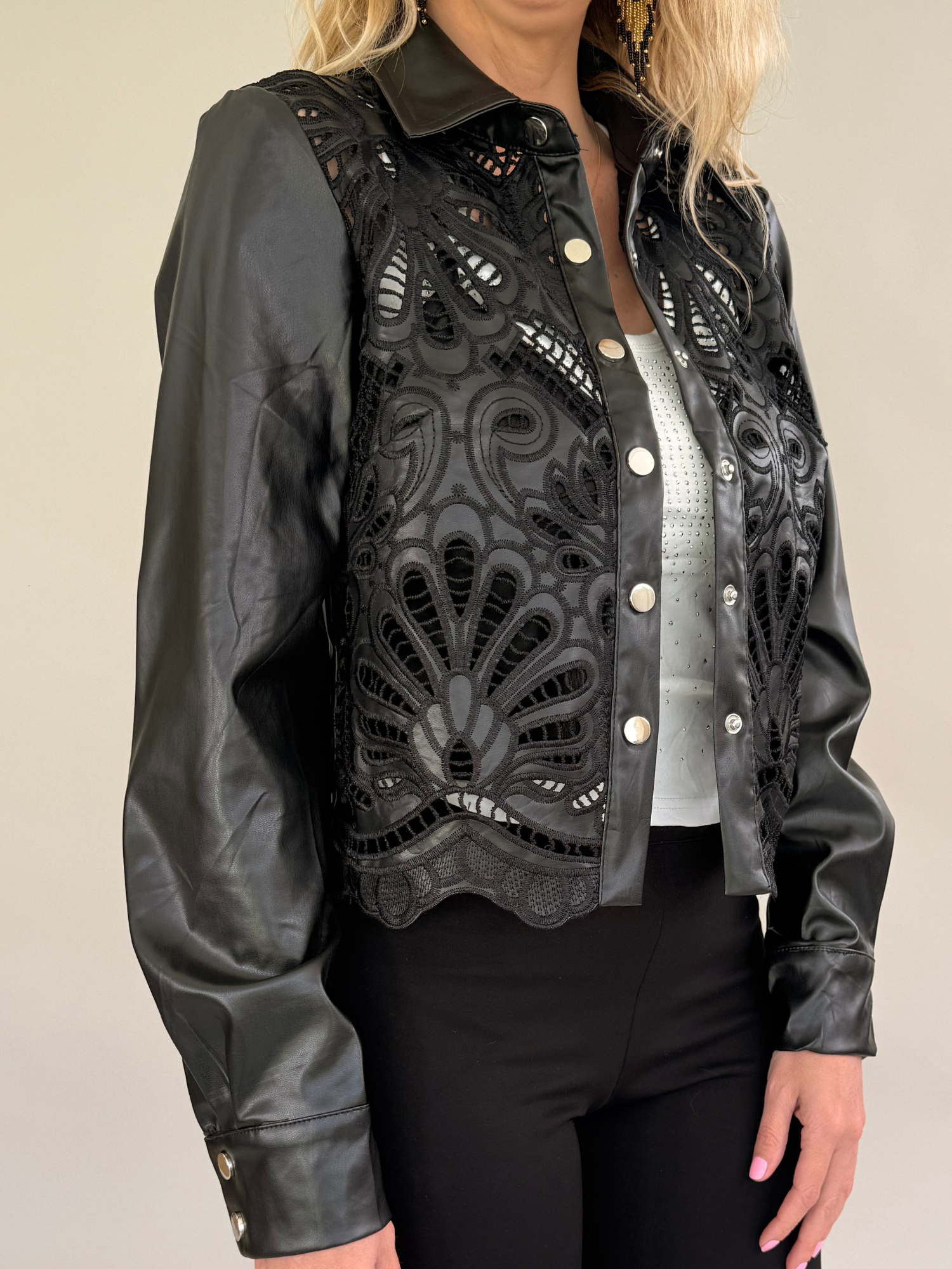 La Chaqueta sobrecamisa de ecocuero color negro combina la fuerza del diseño contemporáneo con la delicadeza del detalle artesanal. Su estructura tipo sobrecamisa aporta un aire relajado y moderno, mientras que los encajes de flores añaden un contraste sutil de textura y feminidad. El ecocuero suave y flexible brinda una sensación elegante al tacto, ofreciendo una prenda versátil que se adapta tanto a looks casuales como a combinaciones más sofisticadas.