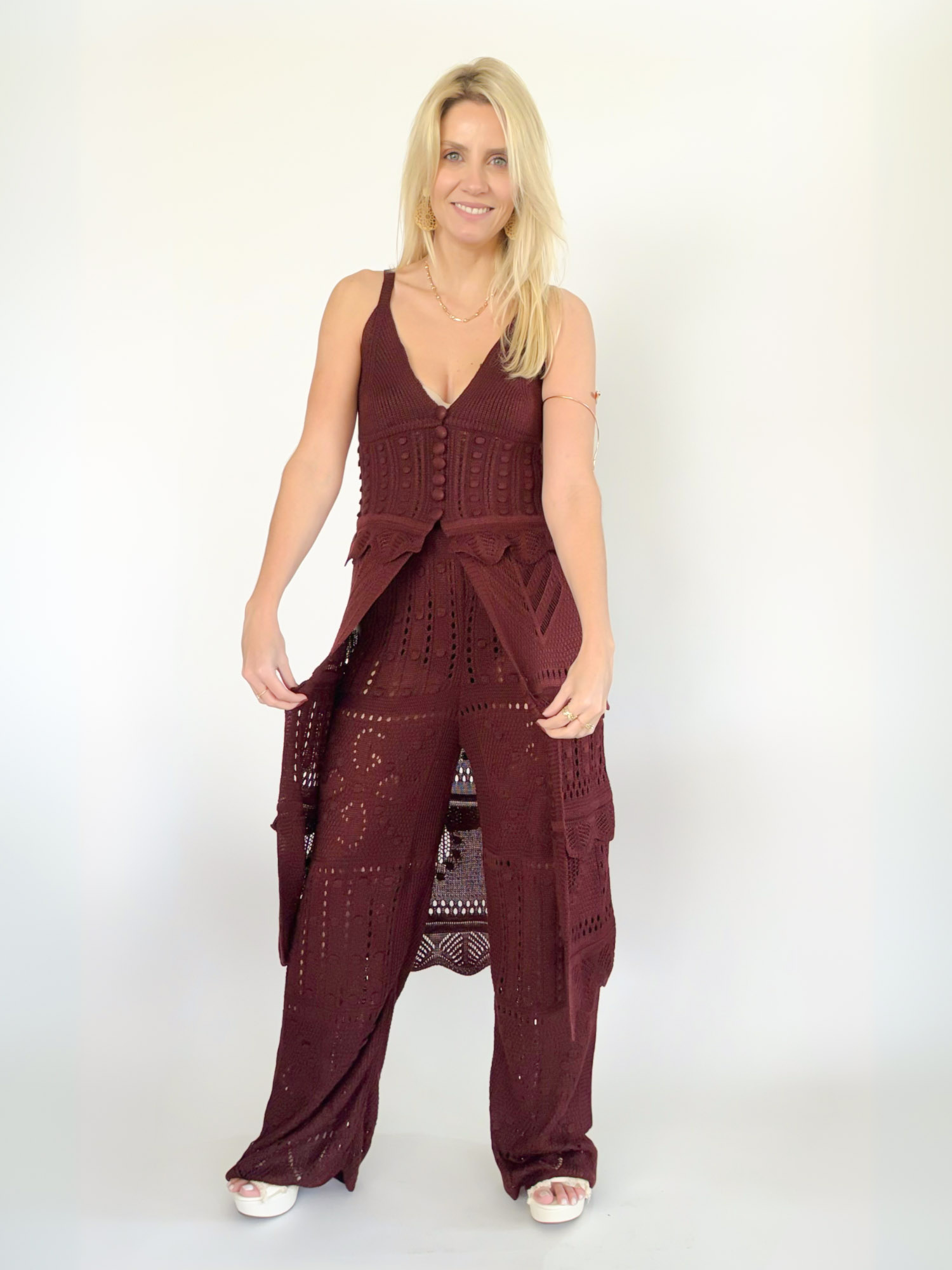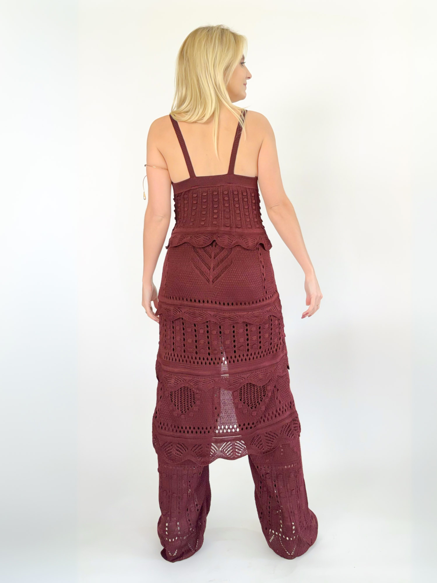 El conjunto tejido en crochet combina artesanía y sofisticación en un diseño único y versátil. La polera larga sin mangas aporta frescura y un aire relajado pero elegante, mientras que el pantalón tejido equilibra comodidad y estilo con su caída ligera. Una propuesta que refleja modernidad y distinción, perfecta para ocasiones casual chic o para elevar un look de verano con delicadeza.