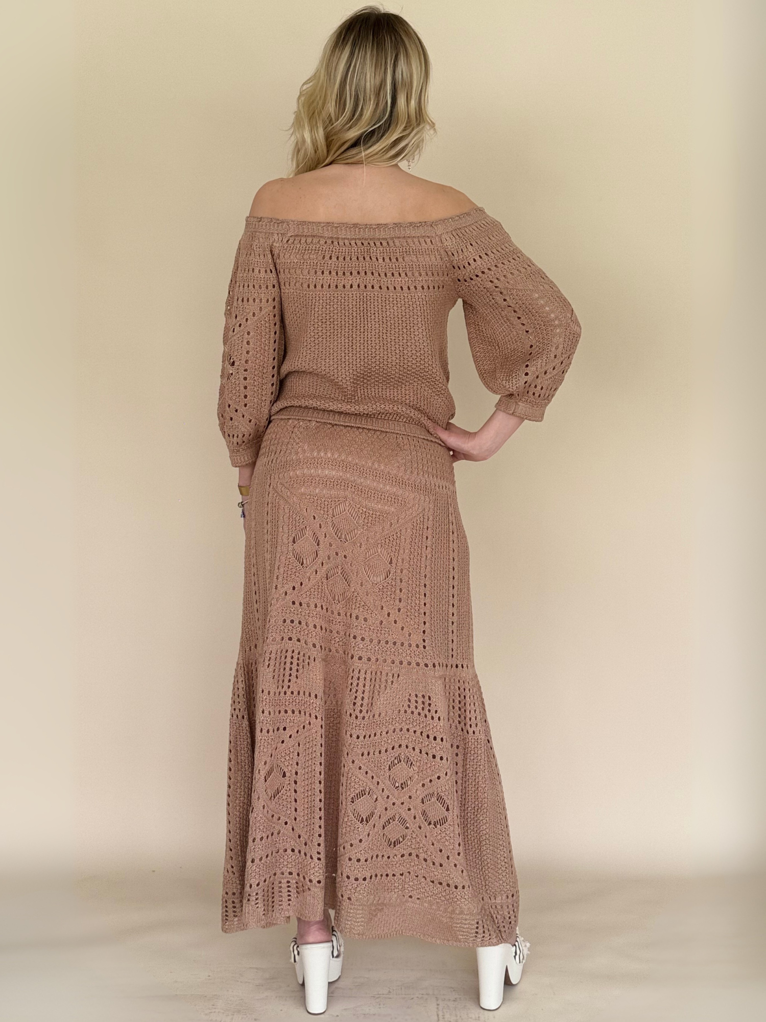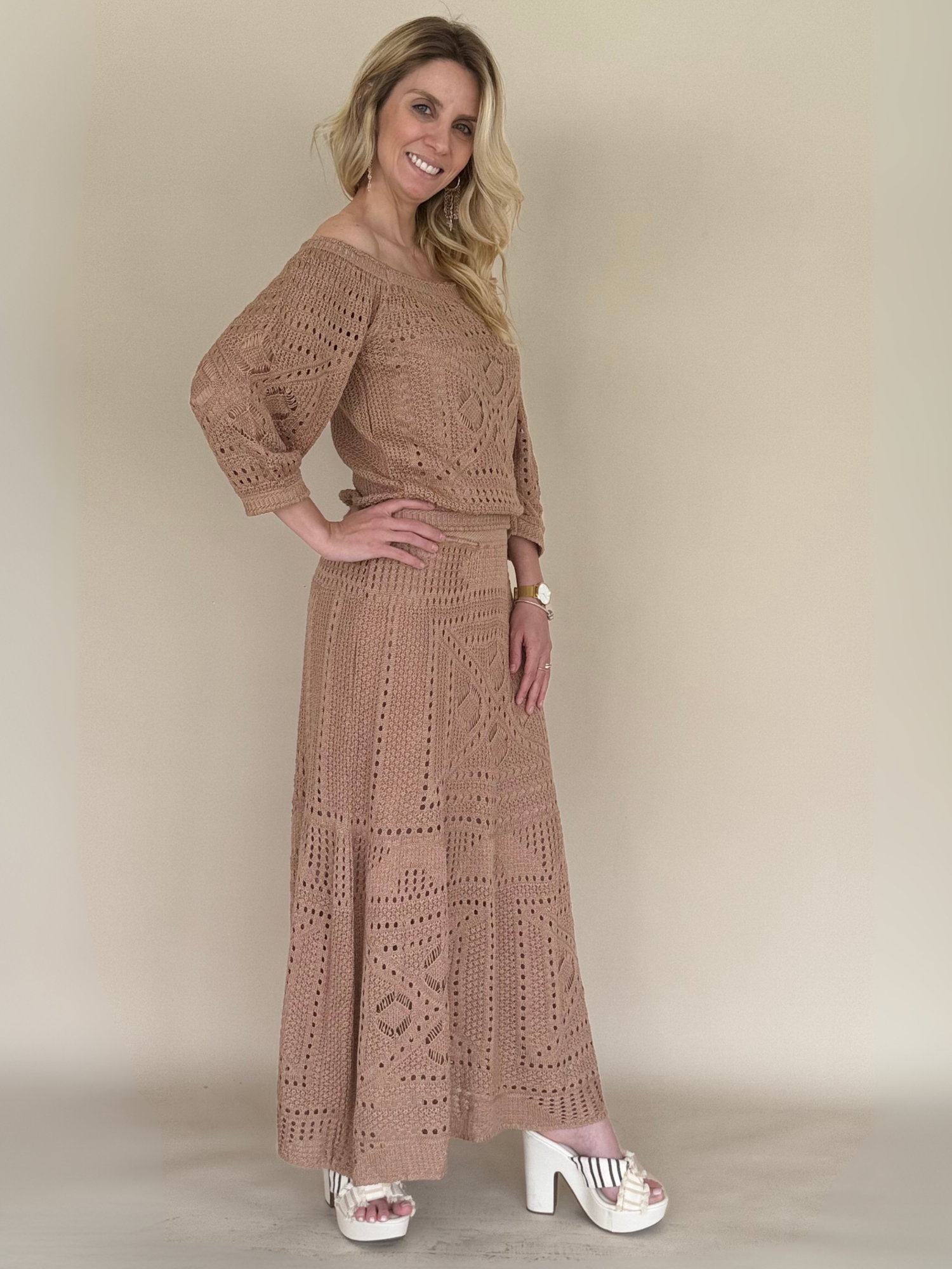 El Conjunto tejido color cappuccino es la perfecta fusión entre elegancia relajada y sofisticación moderna. Compuesto por una falda larga de caída fluida y una polera de manga 3/4 sin hombros, este diseño resalta la silueta con sutileza y encanto natural. Su tejido suave y liviano ofrece confort absoluto, mientras que el tono cappuccino, cálido y neutro, proyecta una estética refinada y atemporal.