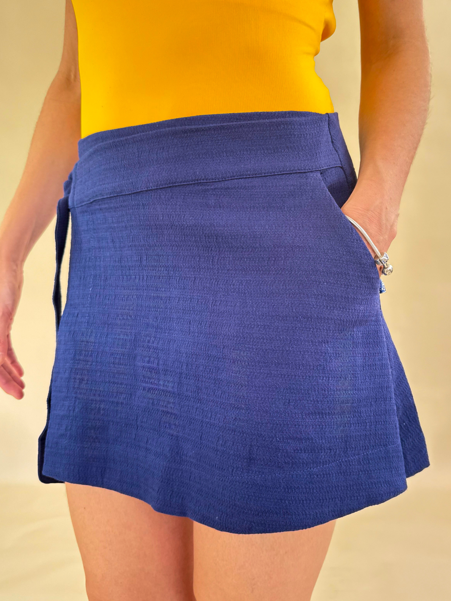 La Falda Short azul es una pieza que fusiona comodidad y estilo en un diseño moderno y funcional. Su corte tipo short interior aporta libertad de movimiento, mientras que la silueta de falda mantiene la elegancia femenina. Los bolsillos funcionales añaden practicidad sin perder estilo, y el detalle de amarre con hebilla lateral ofrece un acento contemporáneo que realza su carácter único.