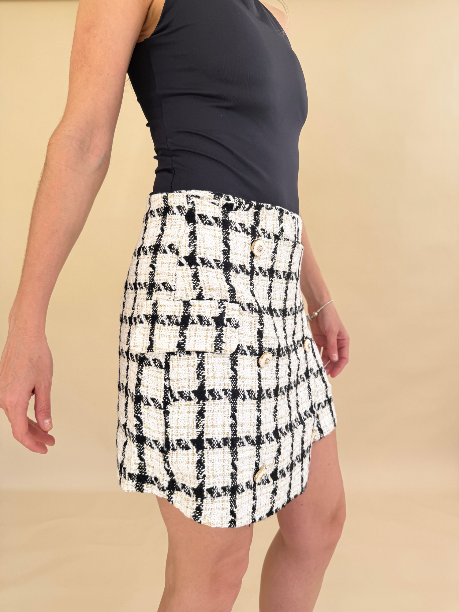 Tip de estilo: Combínala con un top liso o blusa ligera para resaltar el protagonismo del tweed, o con un suéter ajustado y botas altas para un look elegante de temporada. Para un aire más urbano, acompáñala con zapatillas blancas y chaqueta denim. Una pieza que refleja la esencia de Casale & Co.: sofisticación, versatilidad y estilo exclusivo.