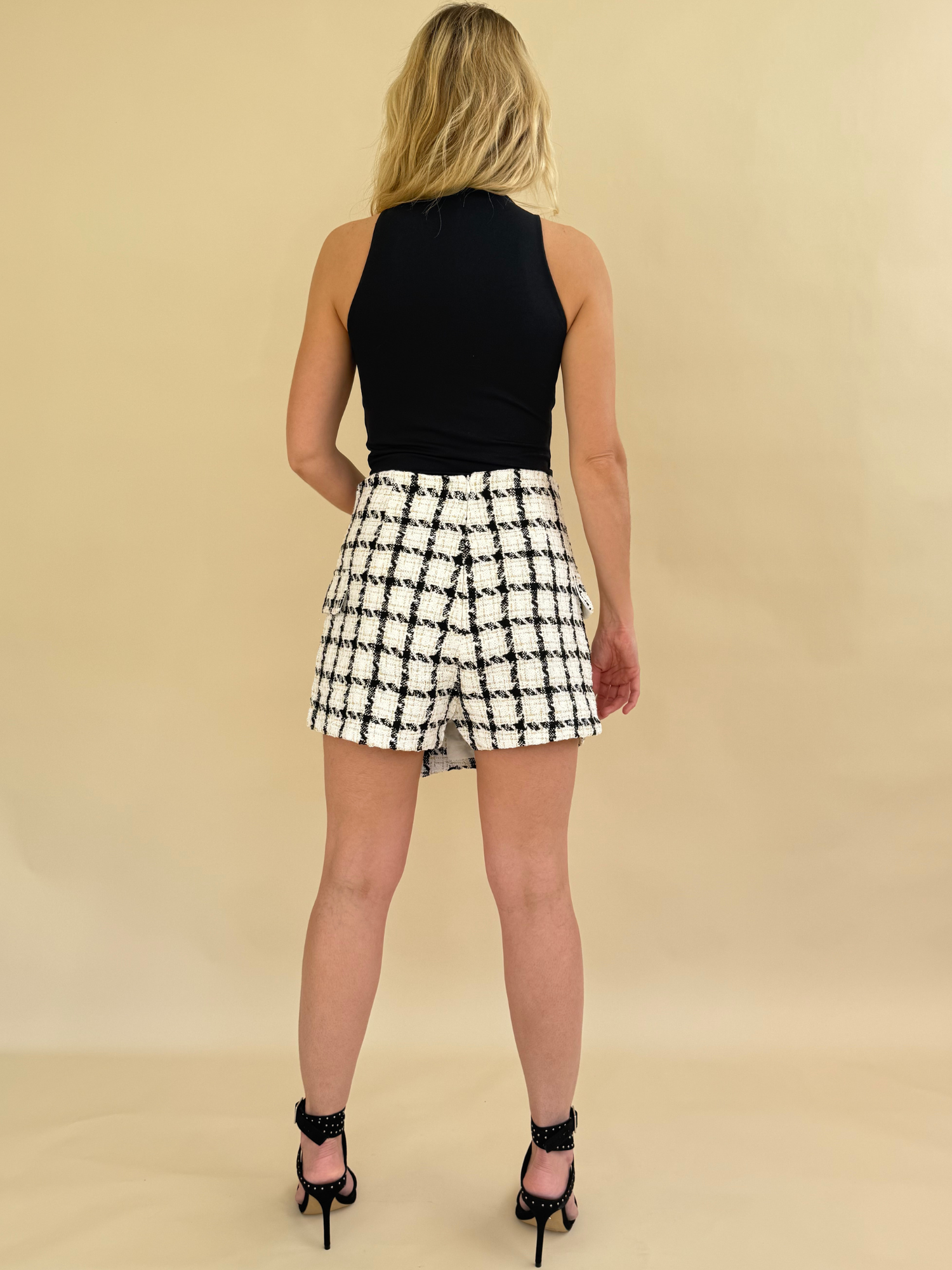 La Falda short cuadrillé en tweed es una pieza que combina el encanto clásico con un aire contemporáneo. Su diseño en textura tweed aporta carácter y distinción, mientras que el corte tipo short interior asegura comodidad y libertad de movimiento. Los botones frontales decorativos añaden un detalle elegante, convirtiéndola en una prenda versátil y refinada para cualquier ocasión.