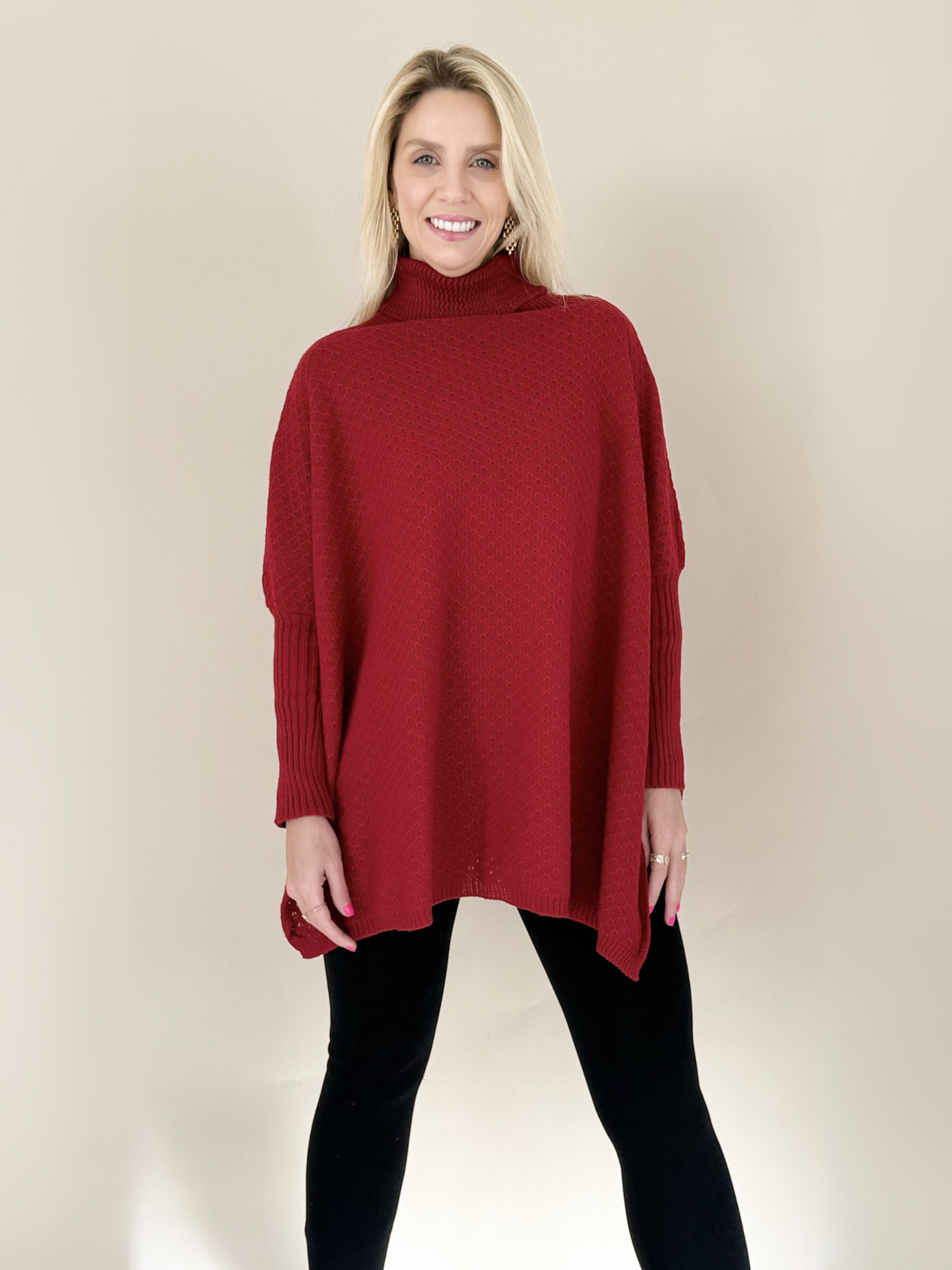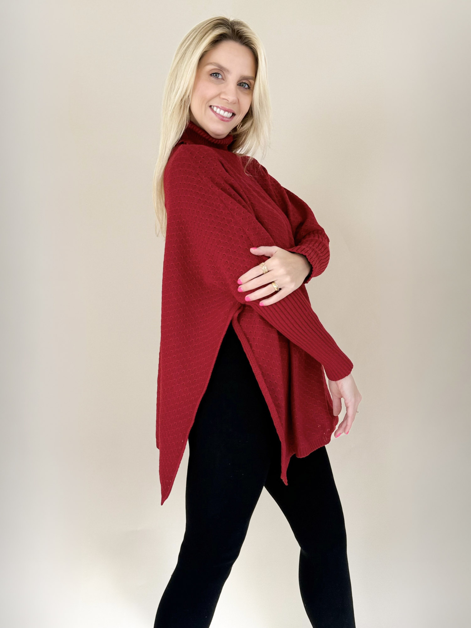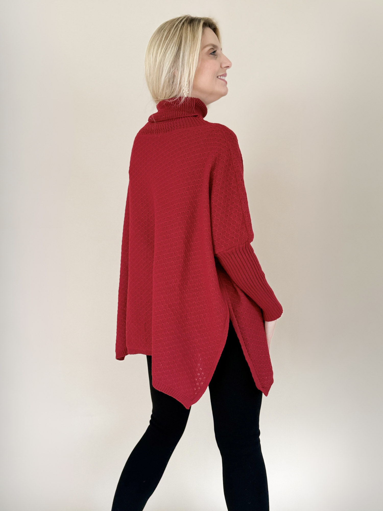 Clásico y sofisticado, el Poncho Leticia cuello alto media manga es una prenda versátil que combina elegancia y comodidad.