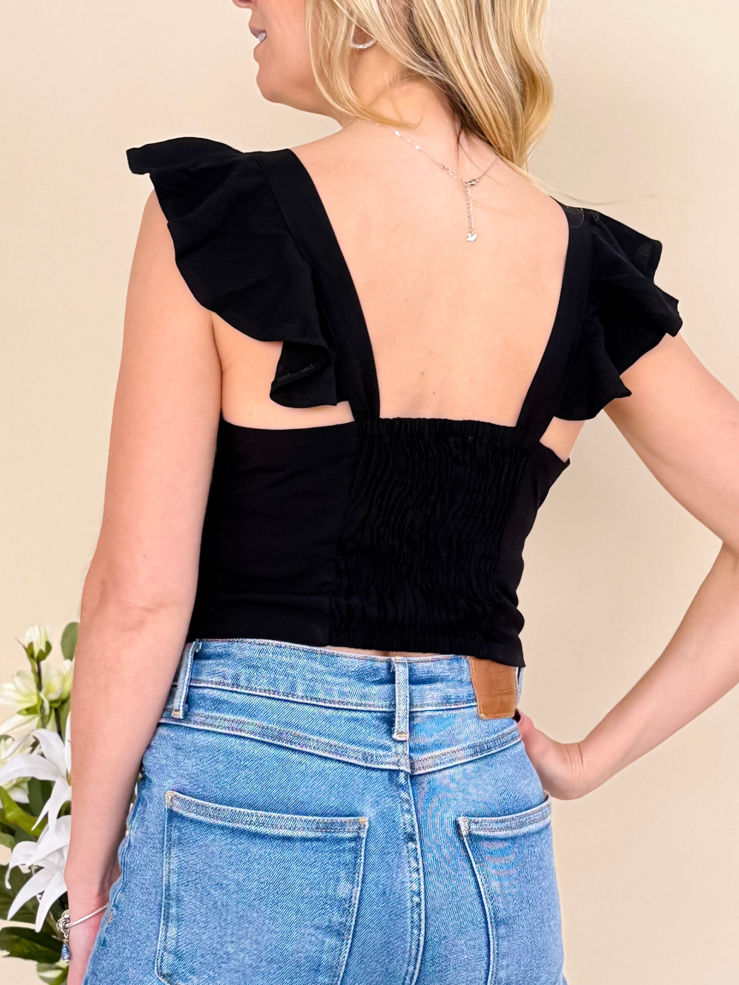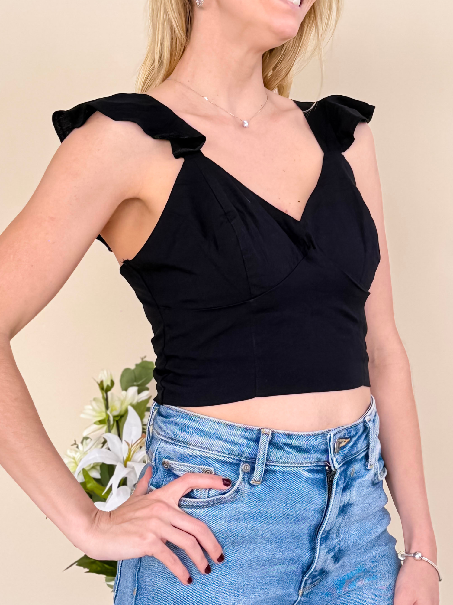 El Top Cropped con tirantes con volantes irradia delicadeza y feminidad con un toque moderno. Su diseño resalta la silueta de forma natural gracias a su corte ceñido y escote sutil, mientras que los volantes en los tirantes aportan movimiento y un aire romántico que realza el diseño con gracia. Confeccionado en un tejido liviano y suave, este top equilibra frescura y elegancia, siendo ideal para looks versátiles de temporada.