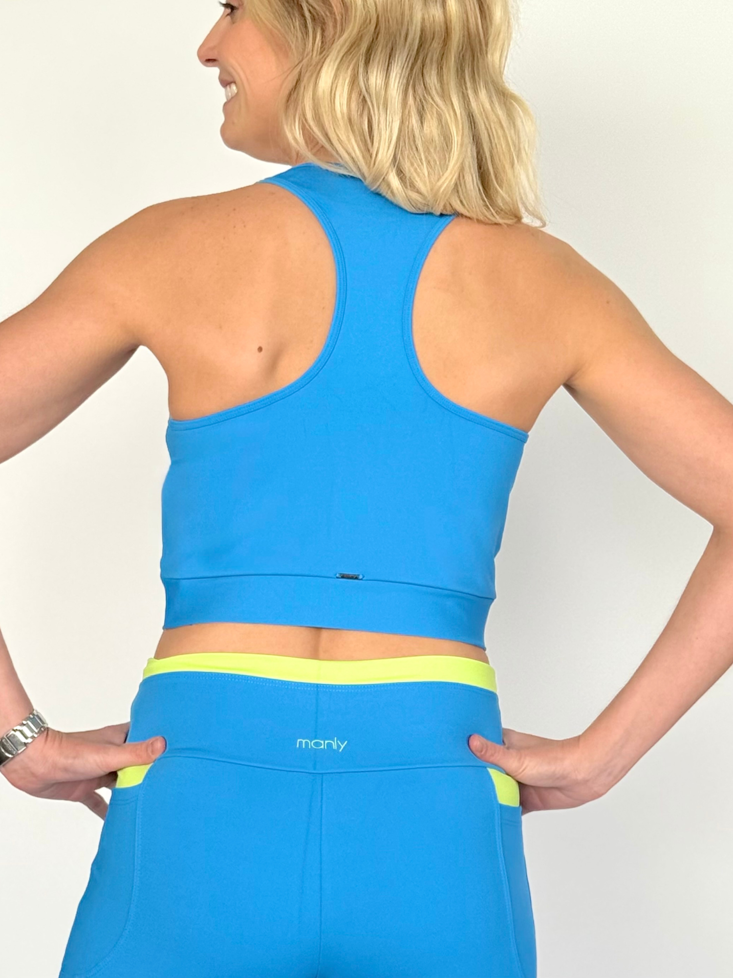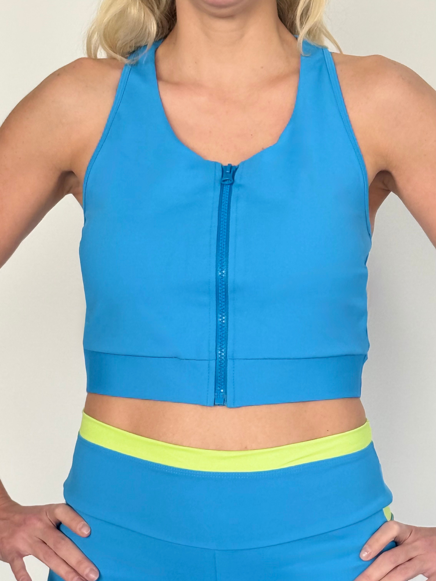 El Top Deportivo Manly fusiona diseño vanguardista y practicidad en una sola pieza. Su cierre frontal añade un toque moderno y funcional, facilitando el ajuste y aportando un aire dinámico. El tono celeste, fresco y vibrante, transmite energía y estilo, mientras que su confección en tejido elástico y transpirable ofrece comodidad y soporte durante cualquier entrenamiento.