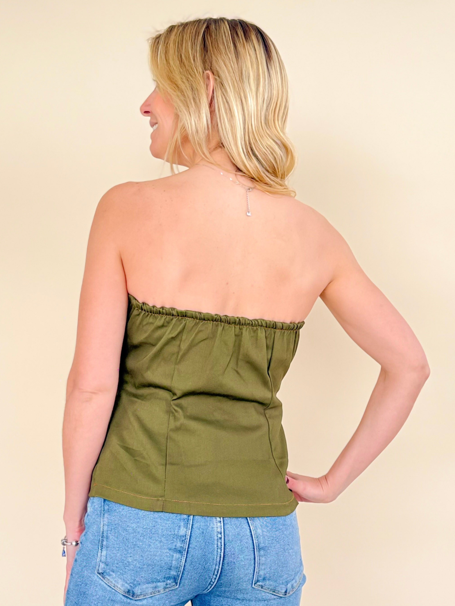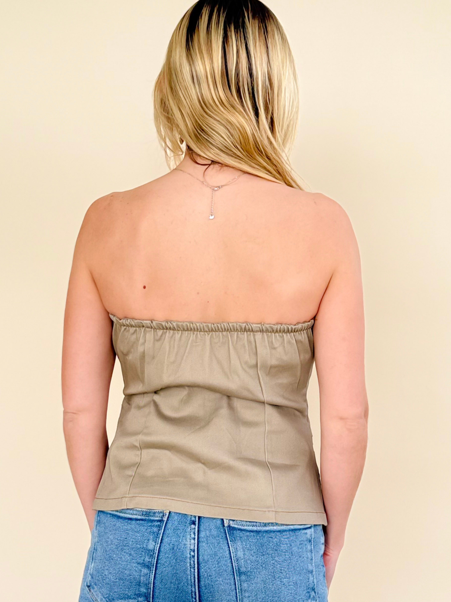 El Top tubo con botones dorados es una prenda que combina minimalismo y elegancia contemporánea. Su corte ajustado y limpio realza la silueta con sutileza, mientras que los botones metálicos dorados añaden un toque de sofisticación y brillo sutil. El diseño sin tirantes aporta un aire moderno y sensual, perfecto para looks que buscan equilibrio entre lo clásico y lo audaz.