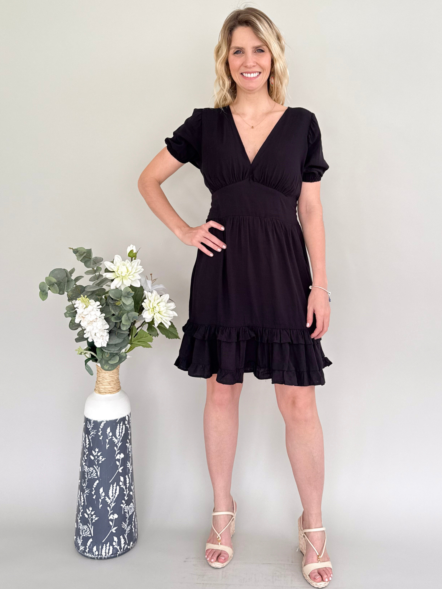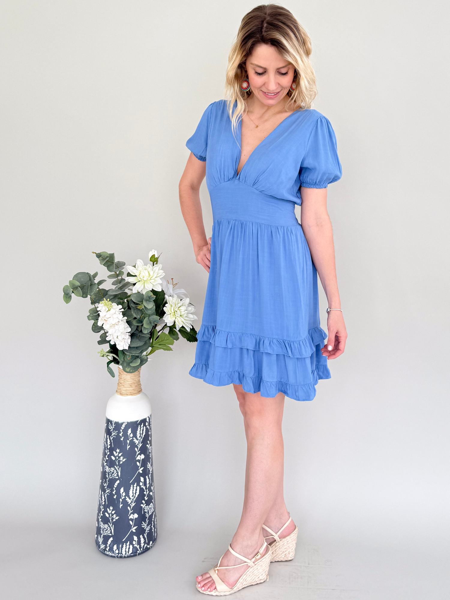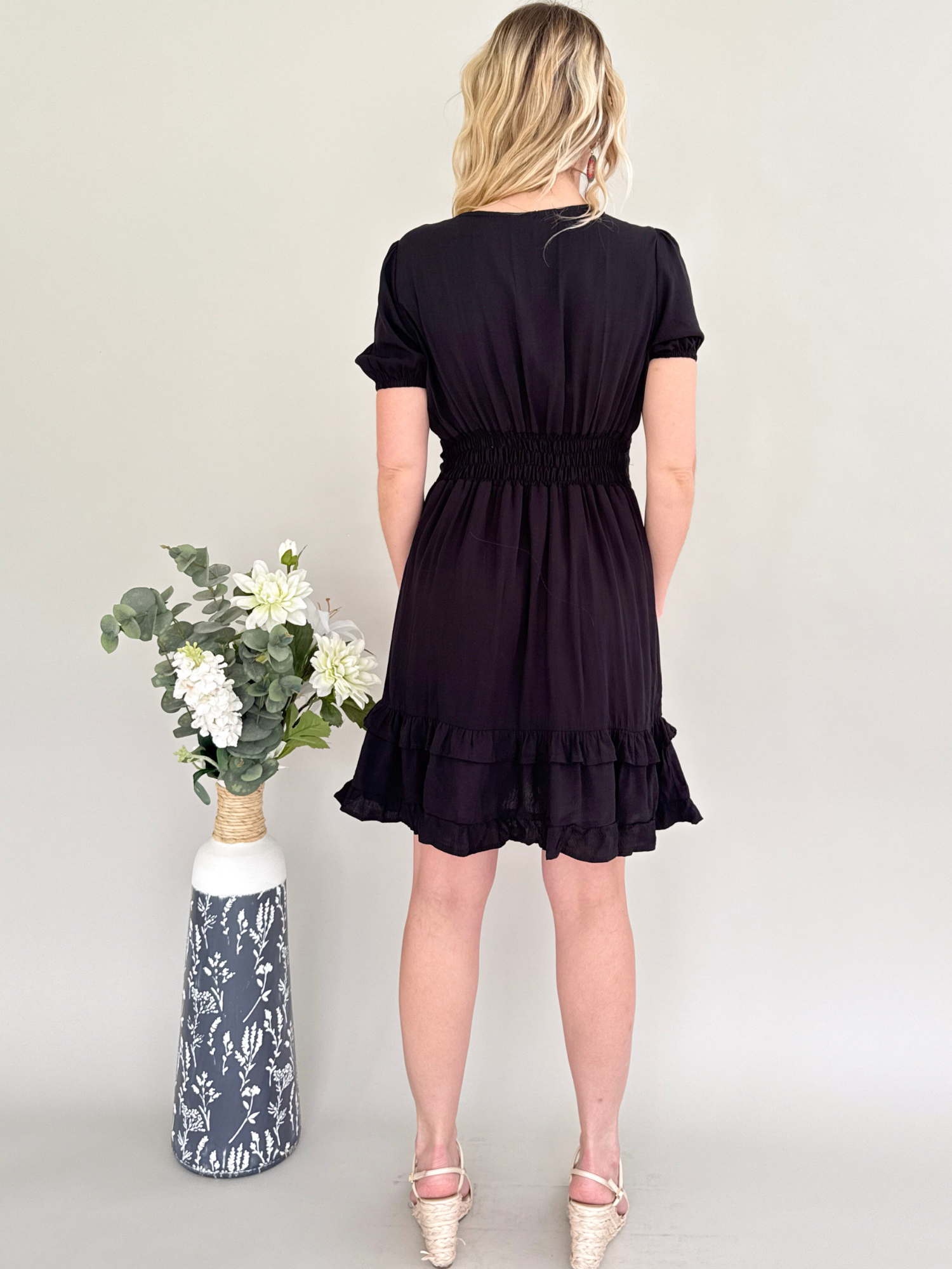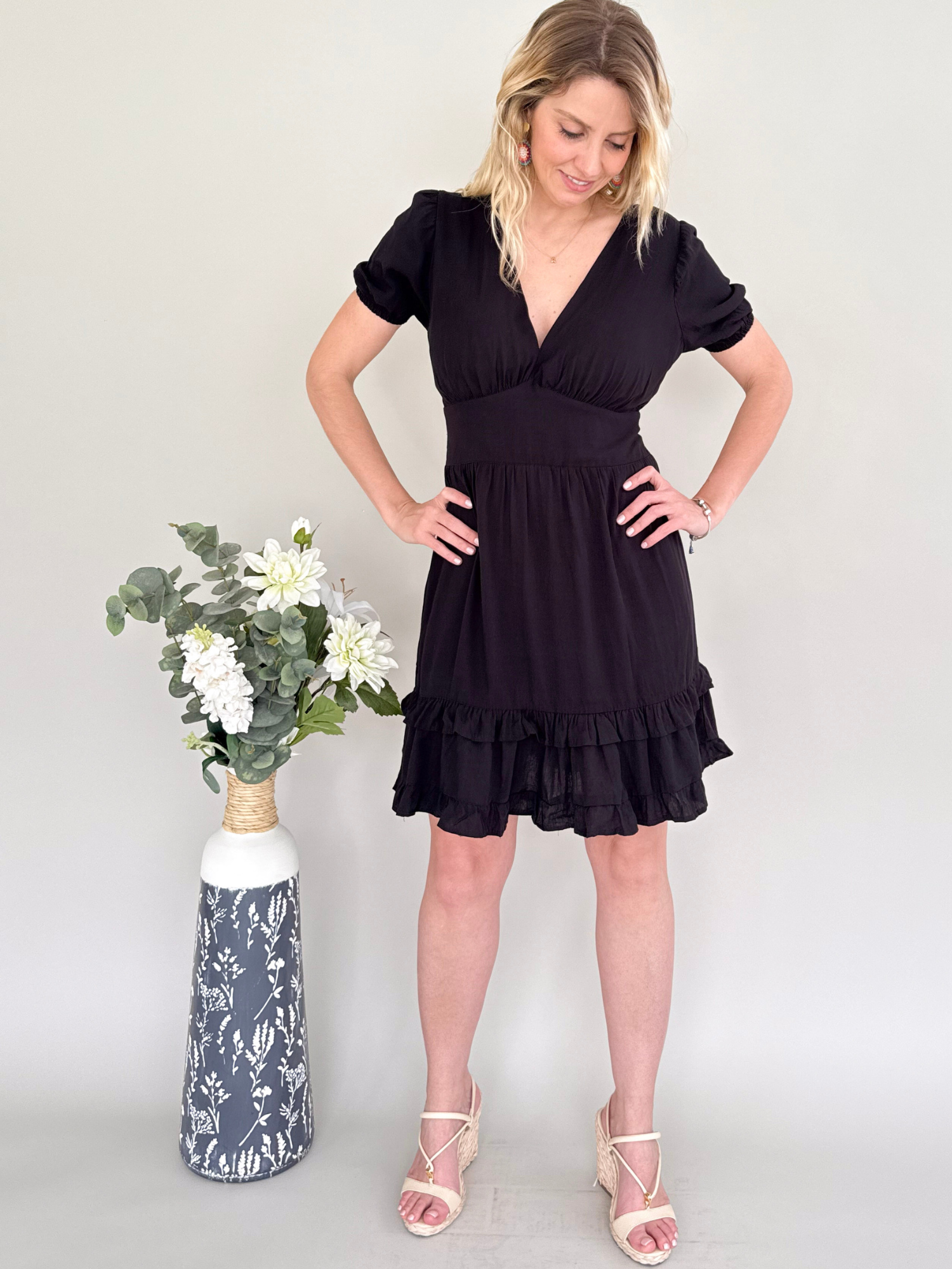 El Vestido corto con escote en V y volantes combina feminidad y encanto en una silueta que realza la figura con naturalidad. Su escote en V aporta un toque delicado y favorecedor, mientras que los volantes suaves enmarcan la falda con movimiento y ligereza. La cintura ajustada define el contorno del cuerpo, creando una forma estilizada y elegante. Confeccionado en un tejido liviano y fluido, este diseño es perfecto para días soleados o momentos especiales con un aire romántico y sofisticado.