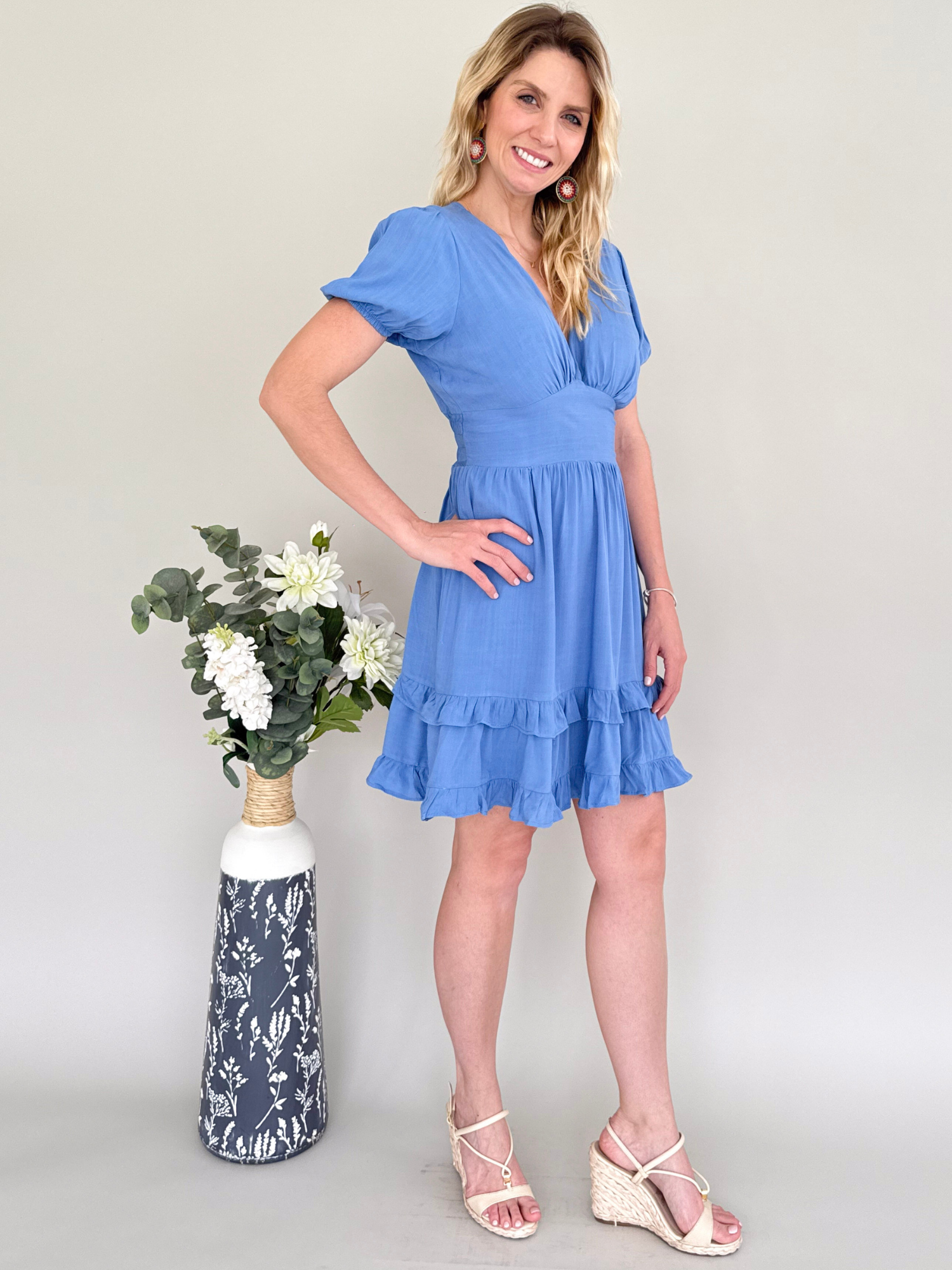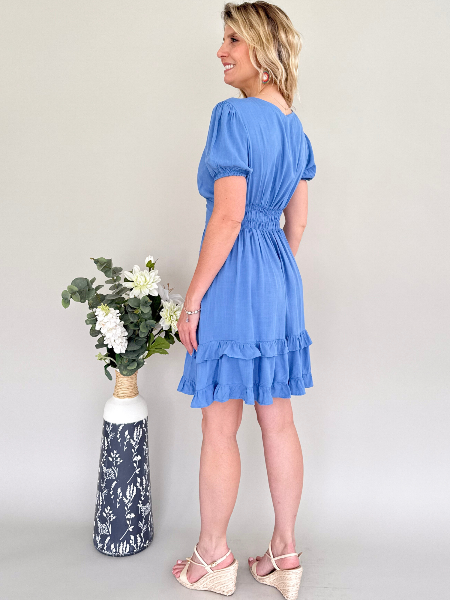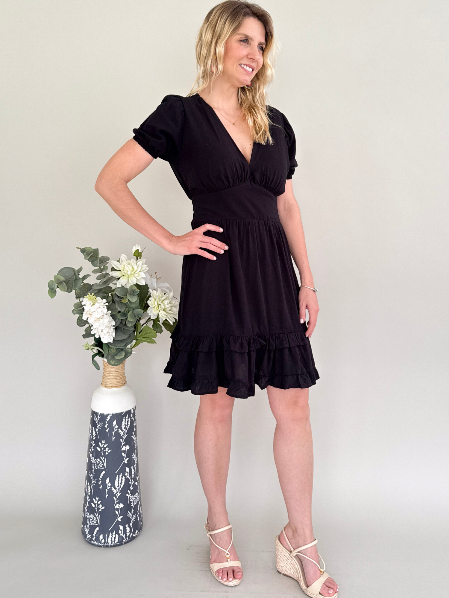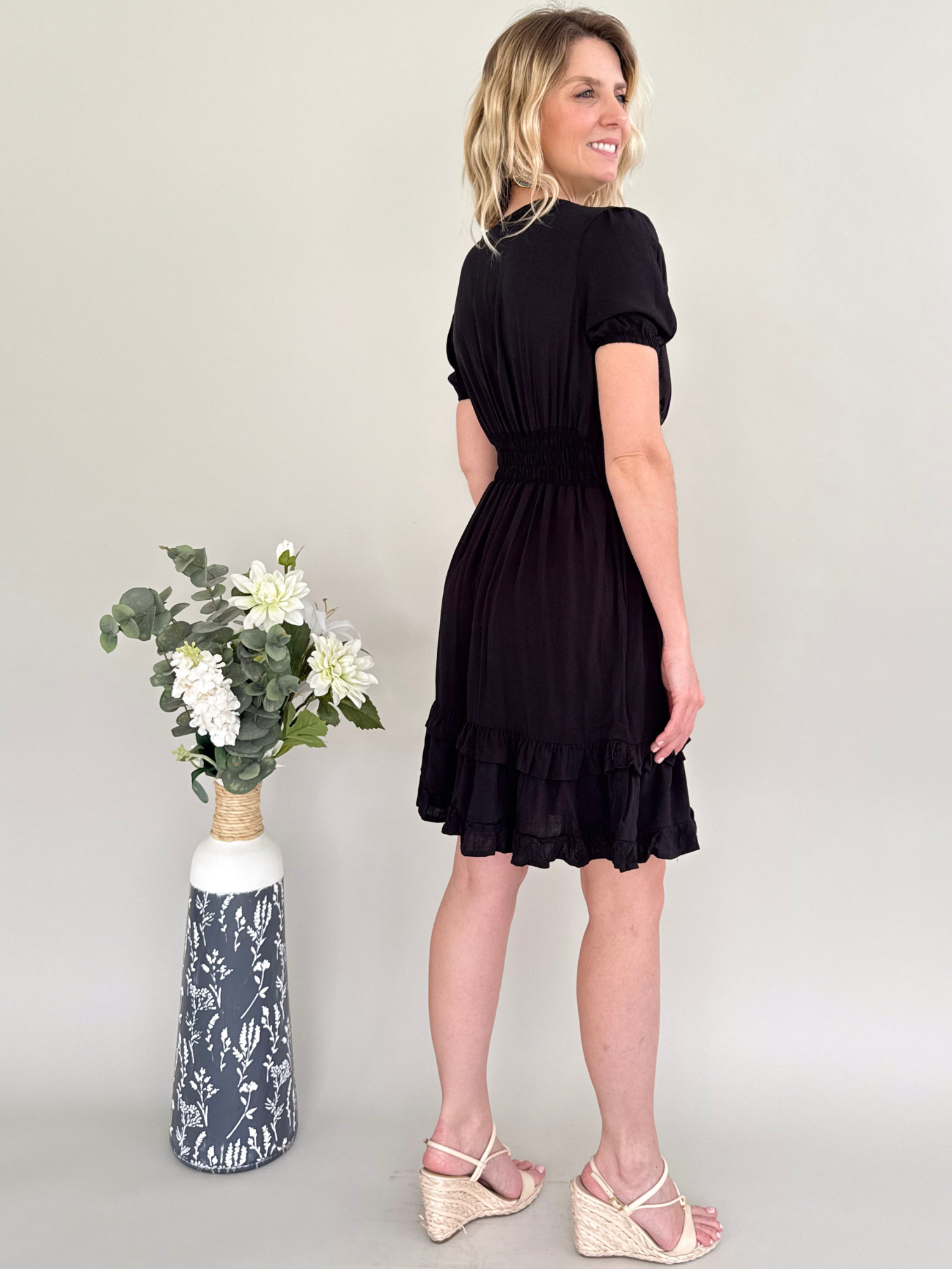 El Vestido corto con escote en V y volantes combina feminidad y encanto en una silueta que realza la figura con naturalidad. Su escote en V aporta un toque delicado y favorecedor, mientras que los volantes suaves enmarcan la falda con movimiento y ligereza. La cintura ajustada define el contorno del cuerpo, creando una forma estilizada y elegante. Confeccionado en un tejido liviano y fluido, este diseño es perfecto para días soleados o momentos especiales con un aire romántico y sofisticado.