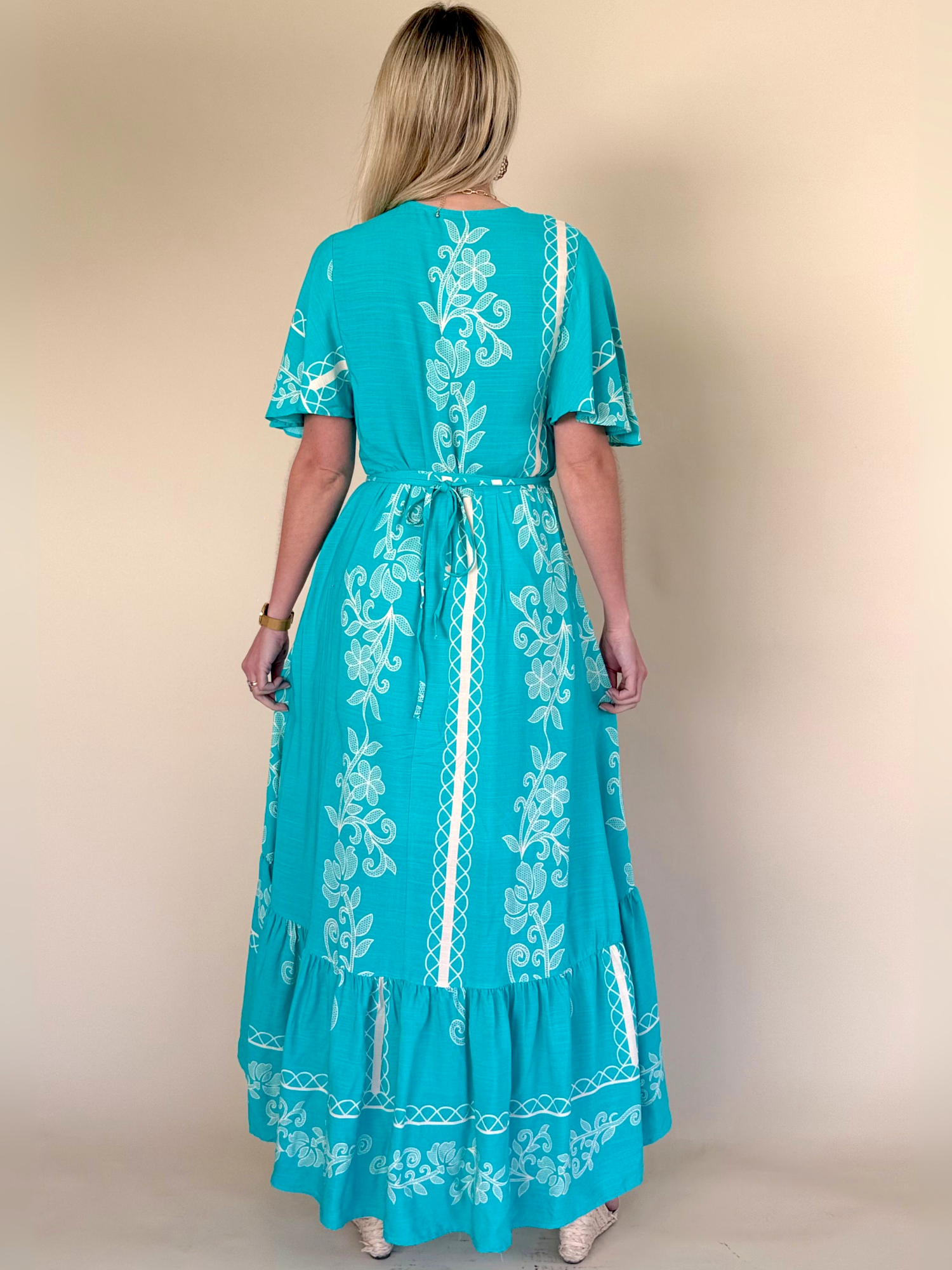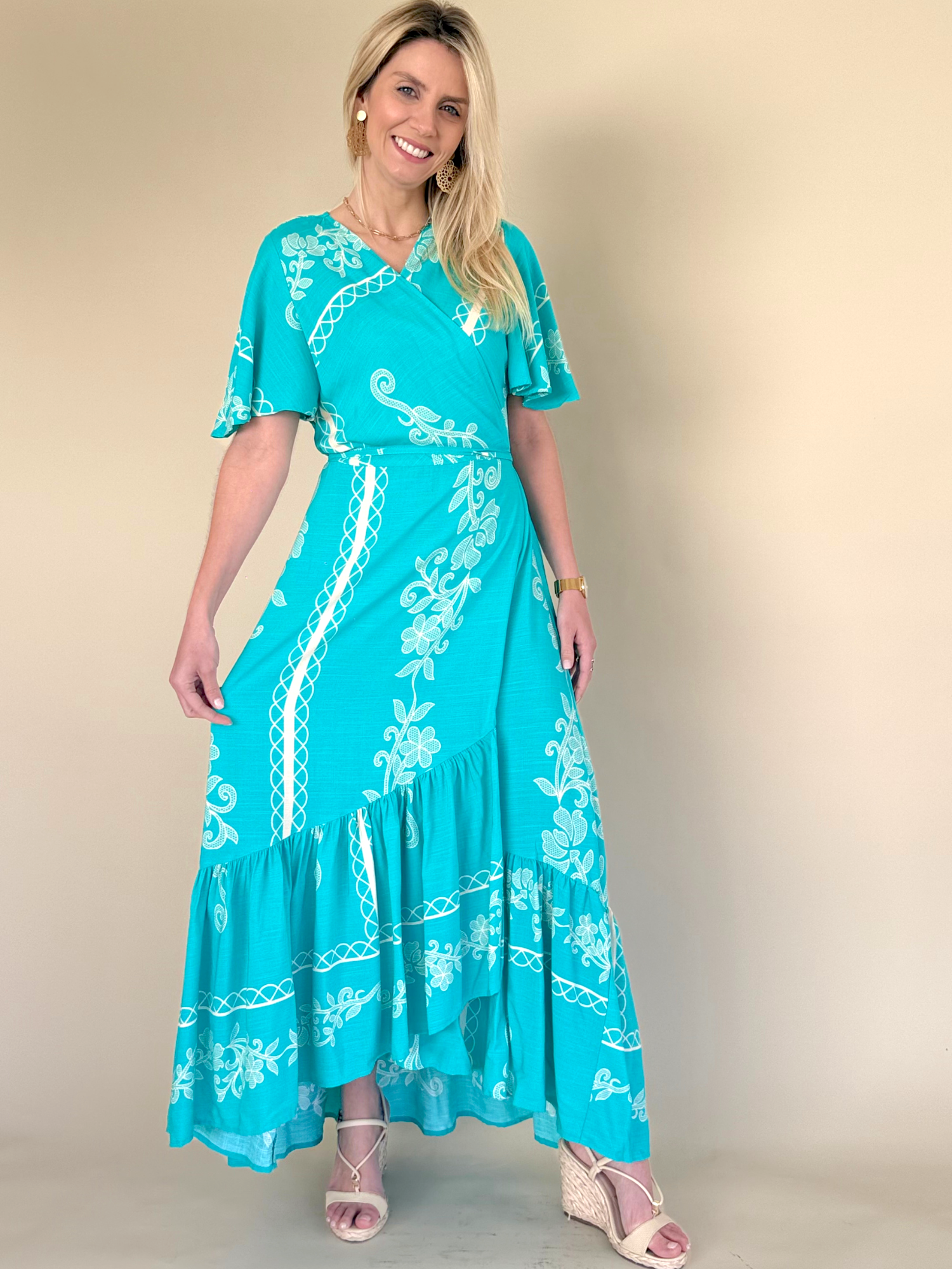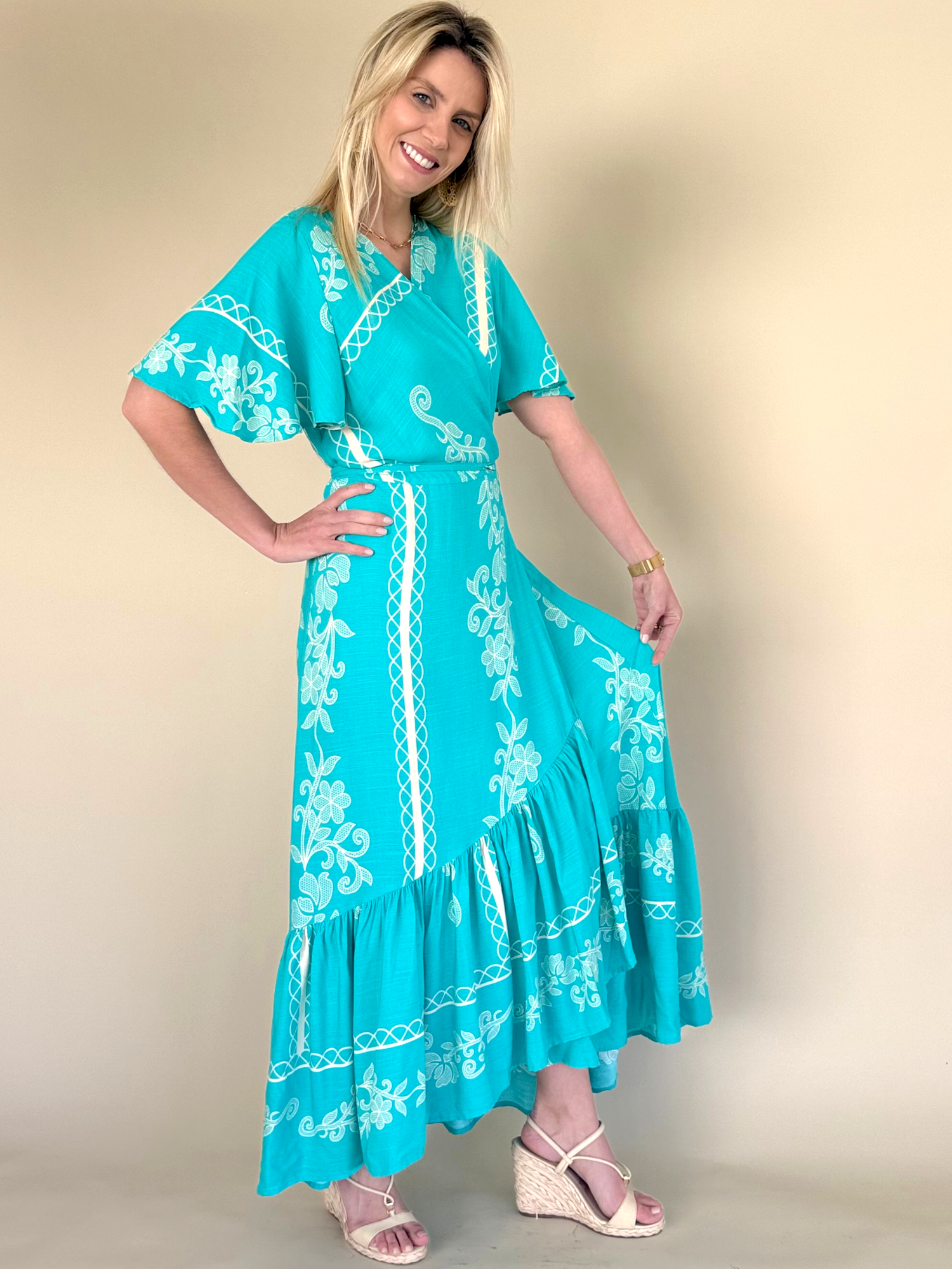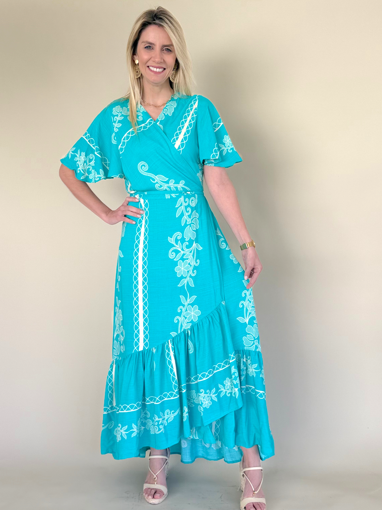 El Vestido cruzado largo en tono turquesa celebra la frescura y la feminidad con un diseño que resalta la silueta de manera delicada. Su corte cruzado frontal estiliza la figura, mientras que el estampado floral aporta un aire romántico y sofisticado. El movimiento fluido de la tela realza la caída natural del vestido, convirtiéndolo en una pieza ideal tanto para el día como para ocasiones especiales al atardecer.