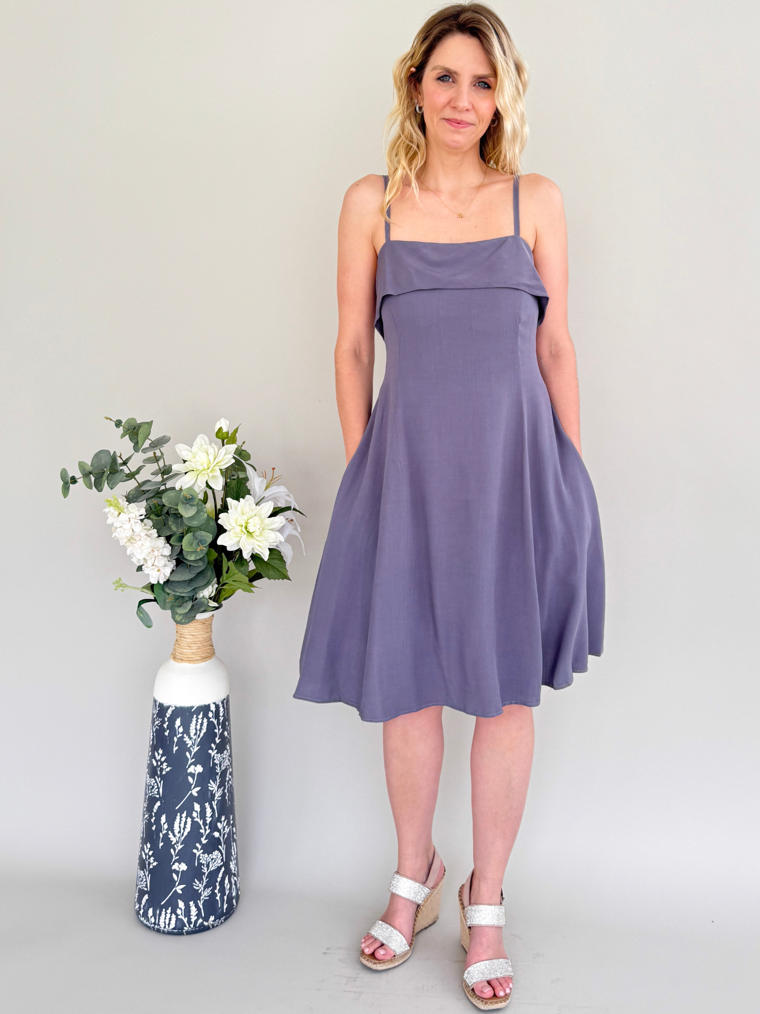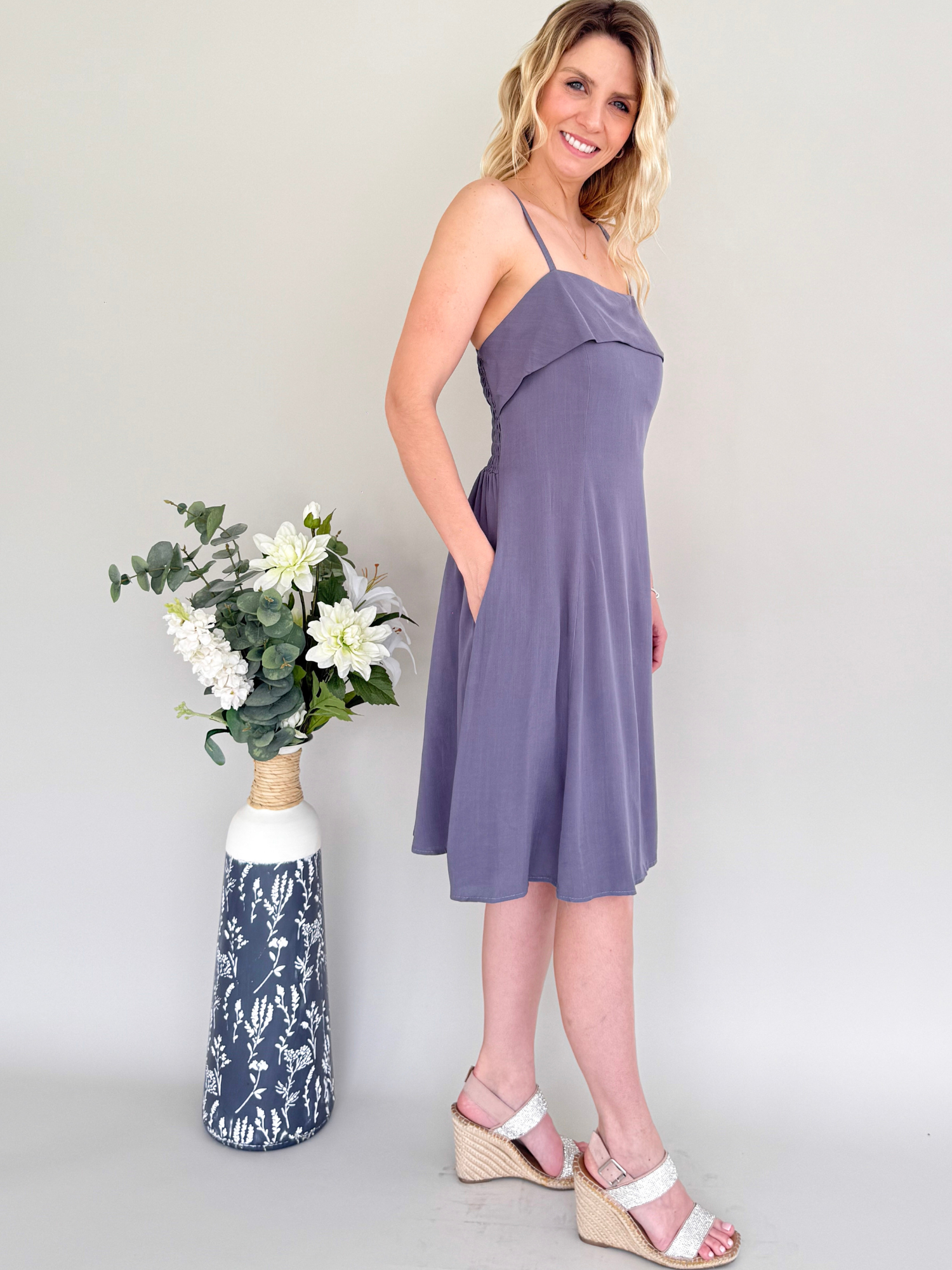 El Vestido Lino refleja la belleza natural del verano con un diseño ligero y encantador. Su silueta acampanada fluye con suavidad, ofreciendo libertad y movimiento en cada paso, mientras que los tirantes finos aportan un toque de feminidad sutil. El volante delicado en el pecho agrega dinamismo y textura, y los bolsillos laterales funcionales lo convierten en una prenda tan práctica como elegante. Confeccionado en un tejido liviano y transpirable, es ideal para acompañar los días soleados con frescura y estilo.