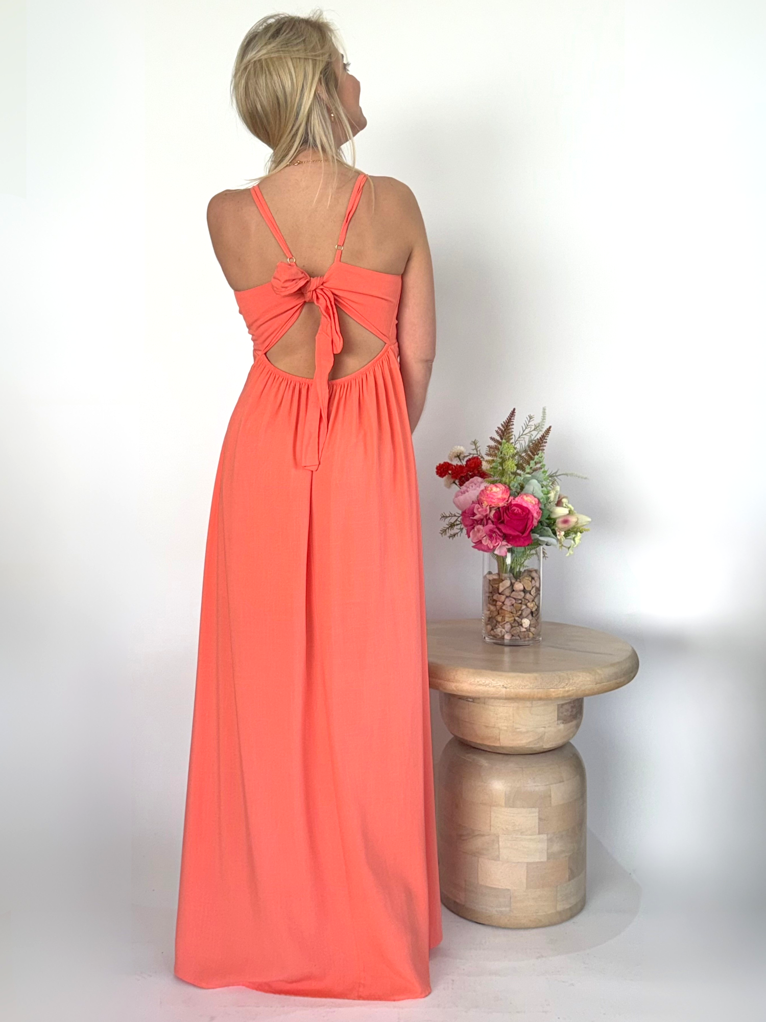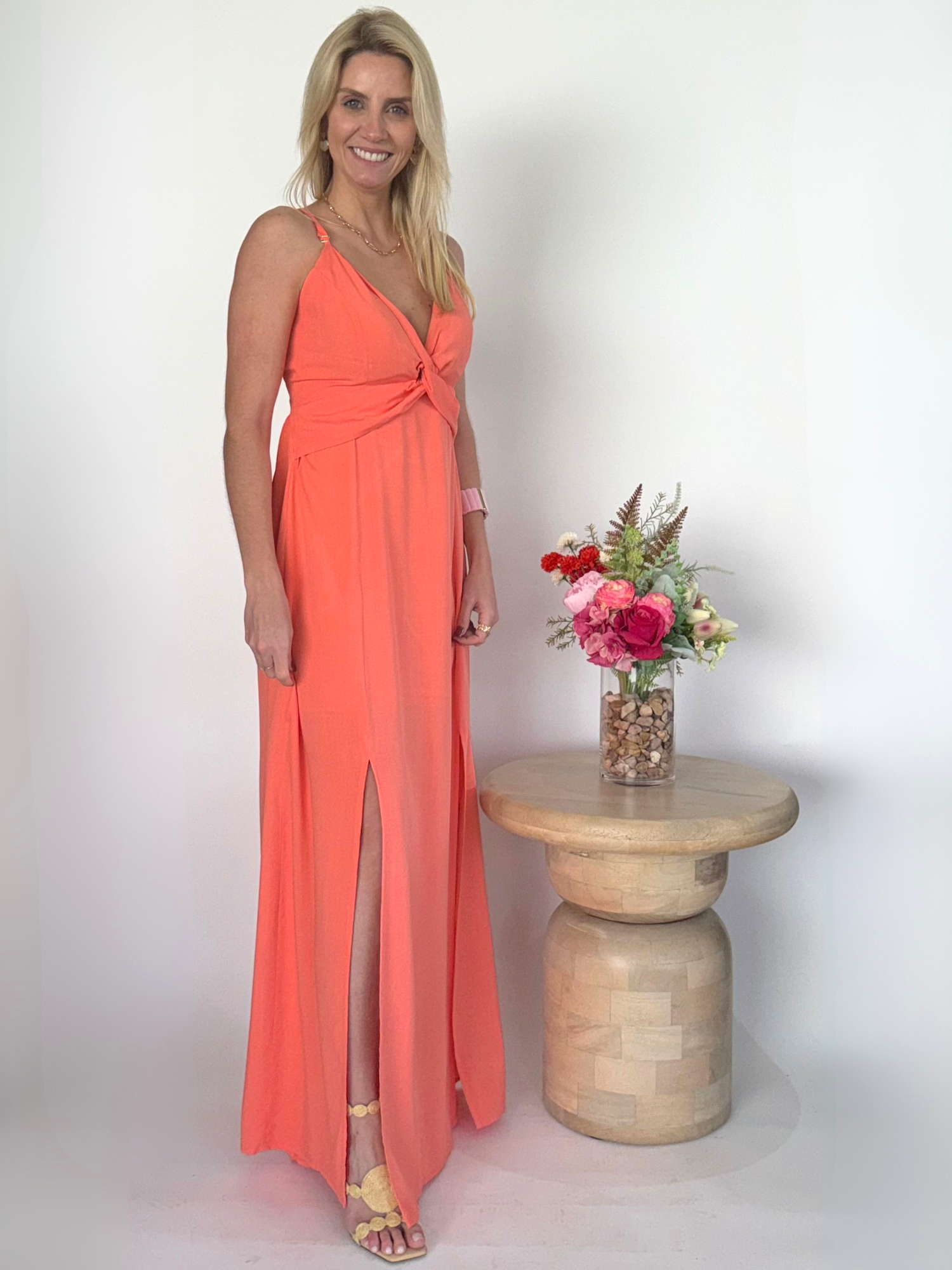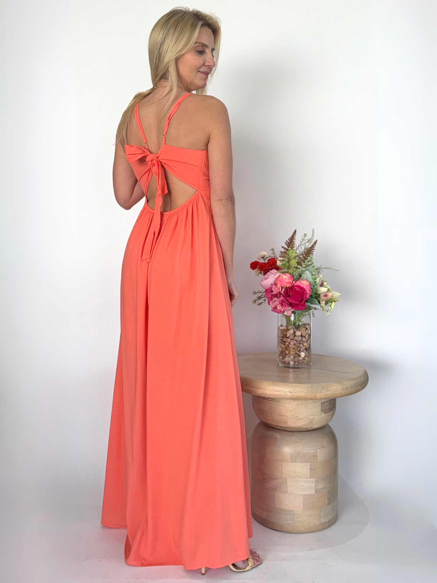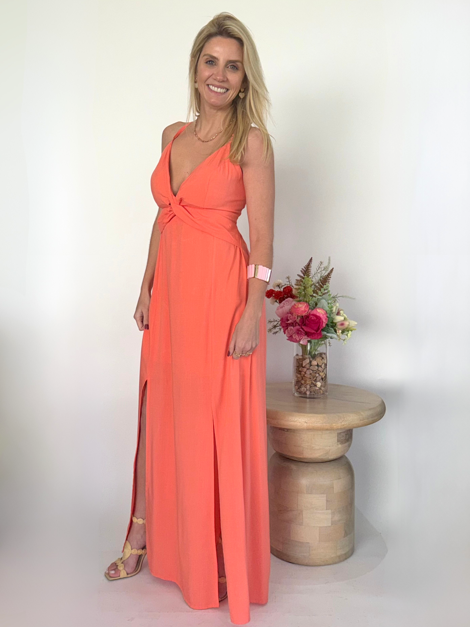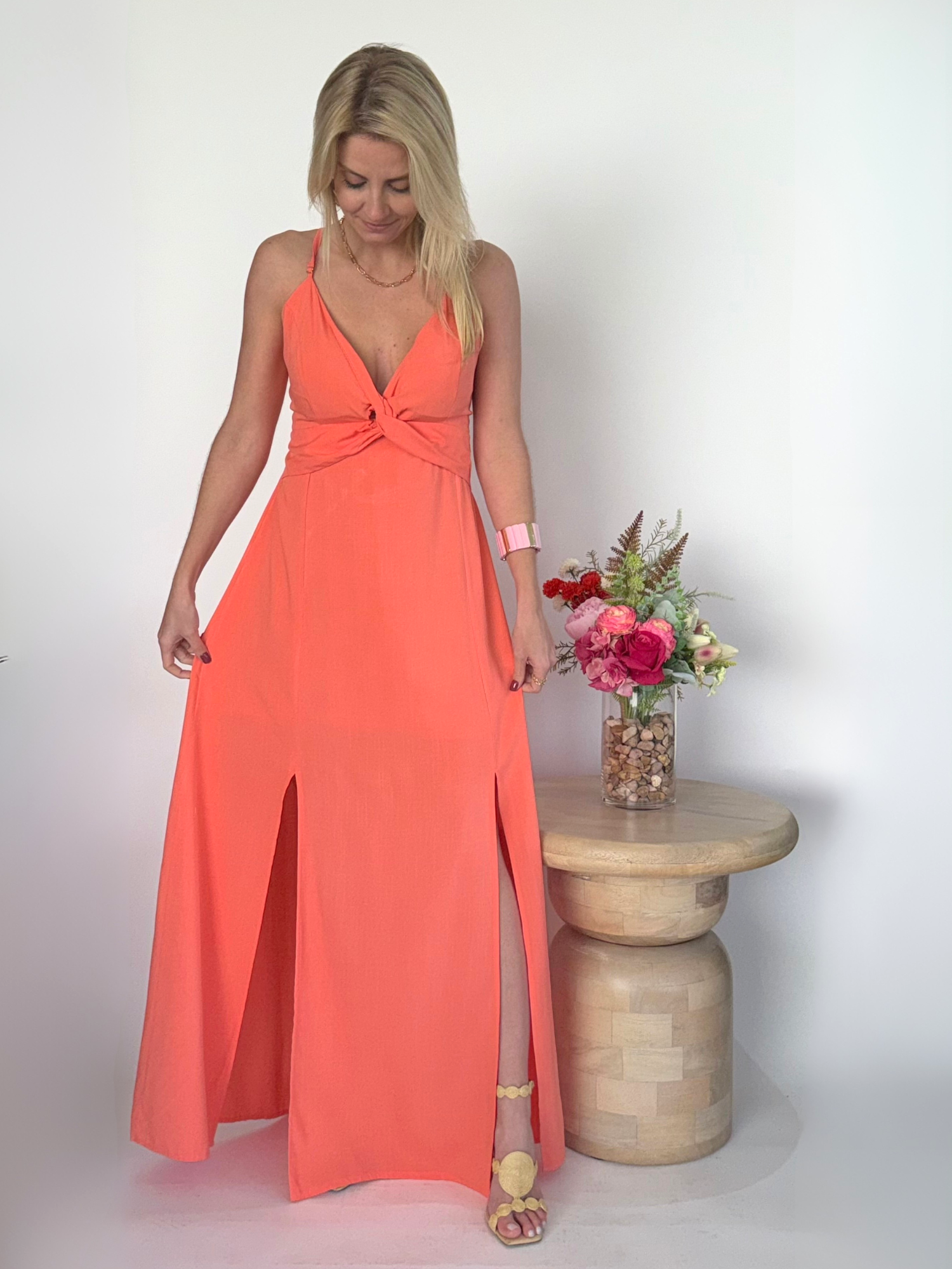 El Vestido largo coral luminoso es una prenda diseñada para deslumbrar. Su detalle girante en el escote crea un punto focal sofisticado y femenino, mientras que las aberturas en las piernas aportan un toque audaz que estiliza la silueta con cada paso. Su color coral intenso transmite frescura y vitalidad, convirtiéndolo en una elección perfecta para eventos donde la elegancia y el impacto visual son protagonistas.