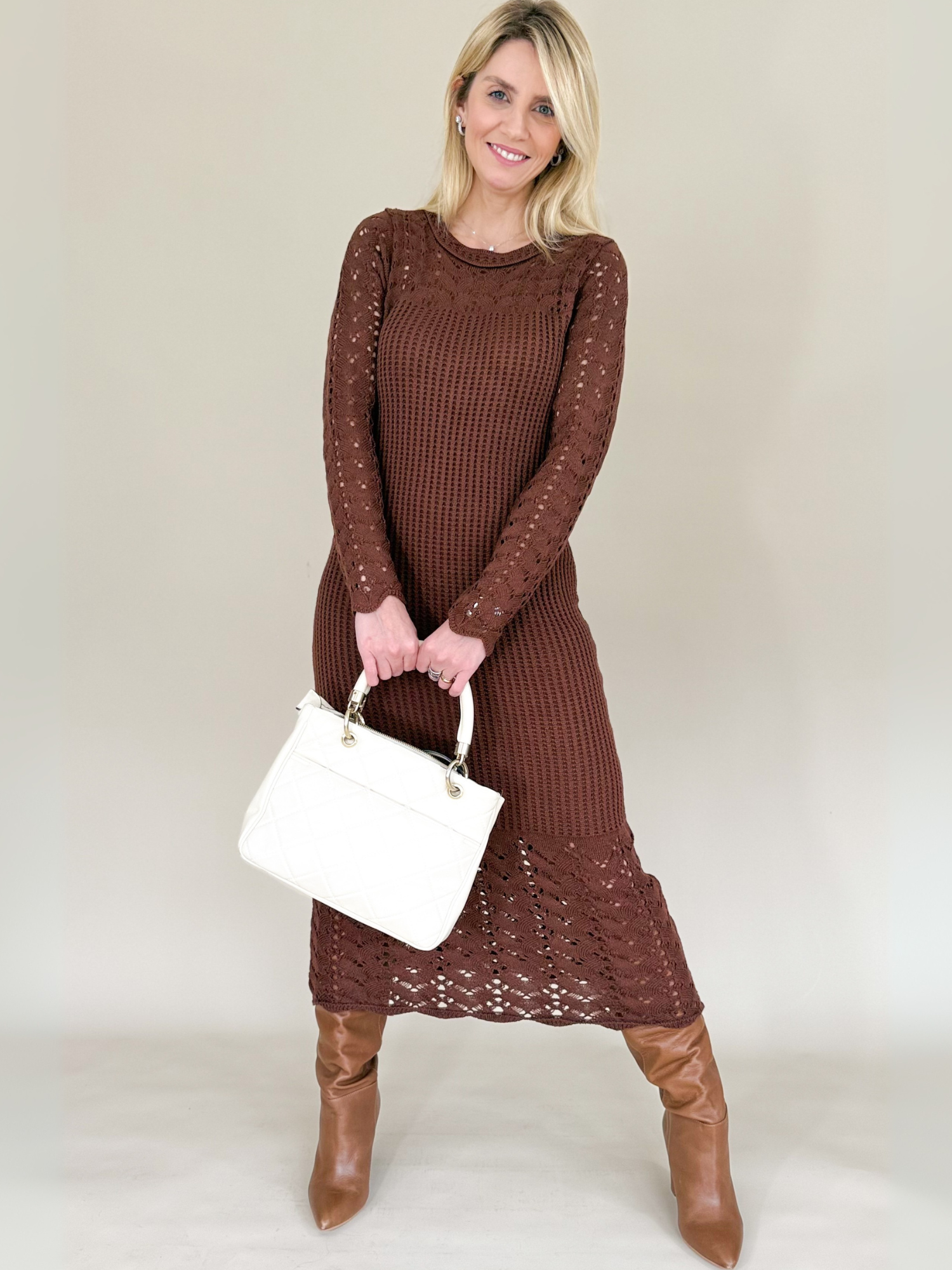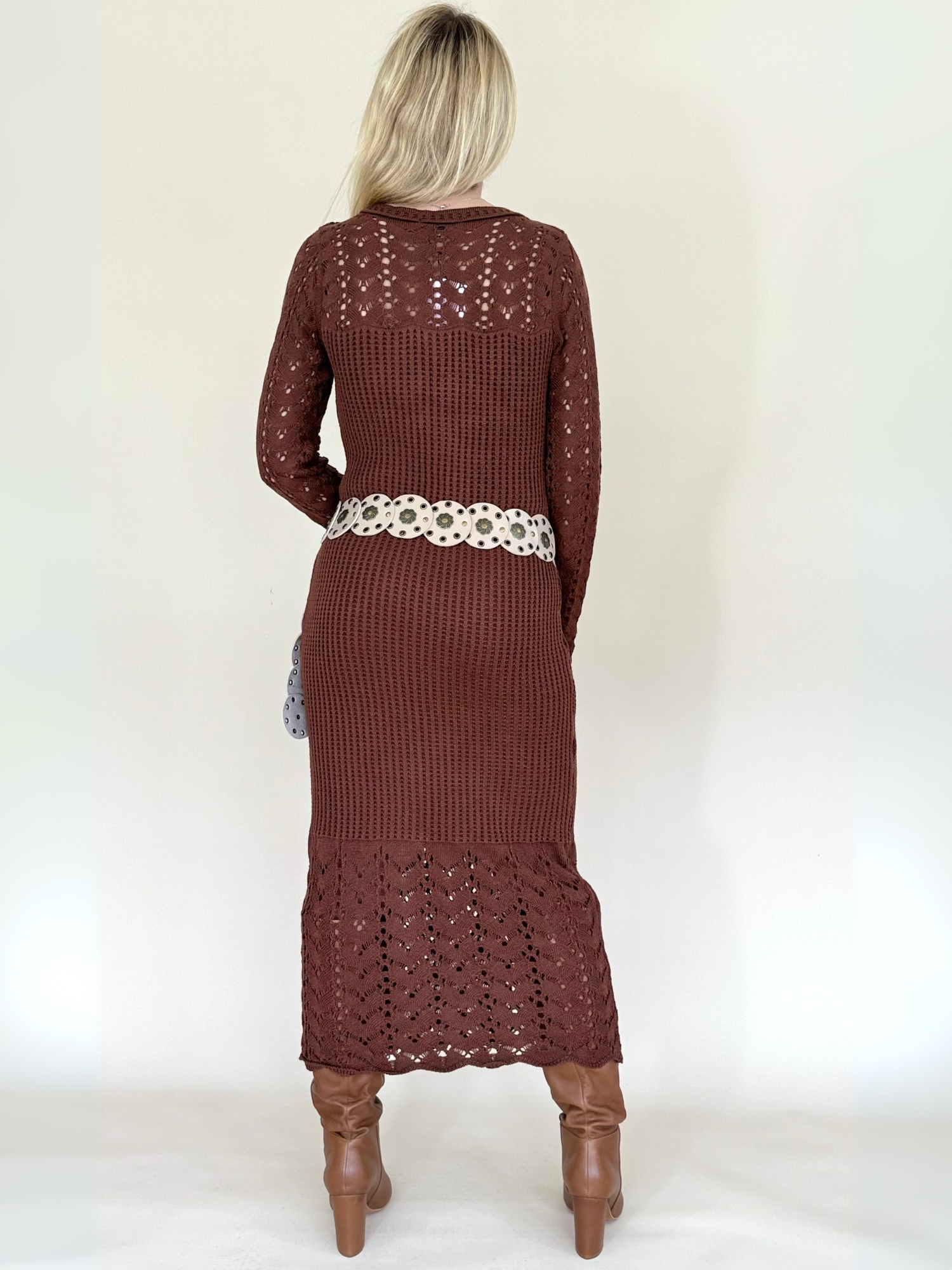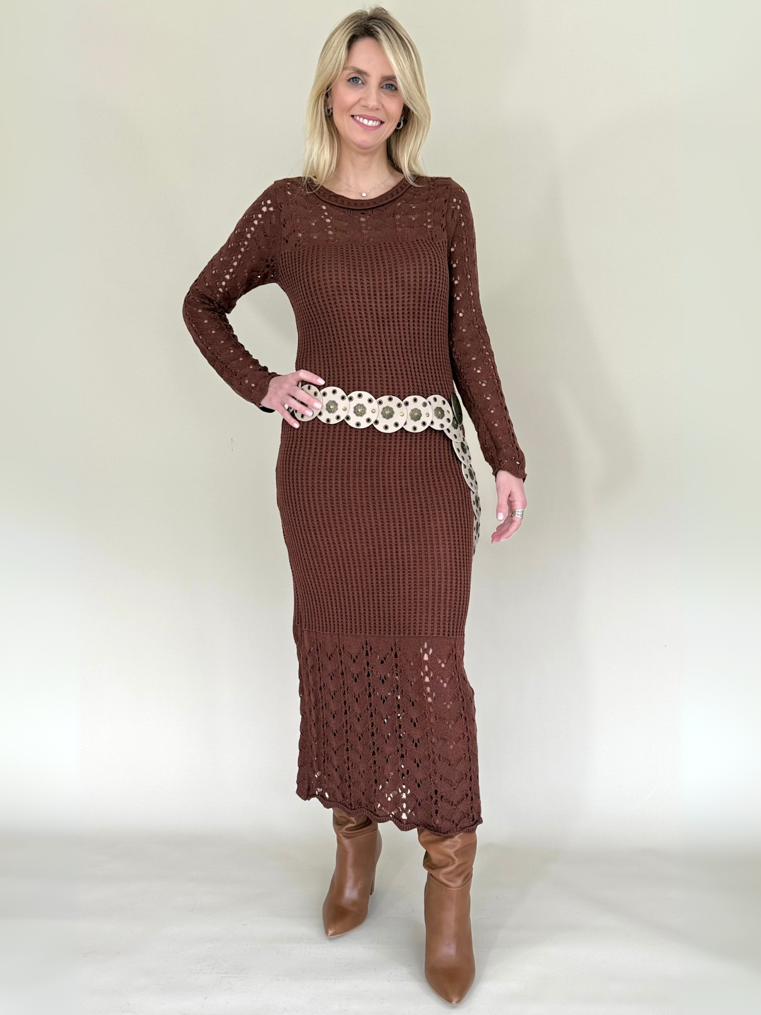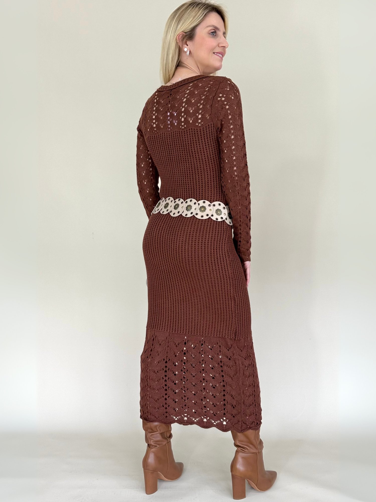 El Vestido largo de tejido en punto color café combina calidez, elegancia y confort en una sola pieza. Su textura suave y elástica abraza la silueta con sutileza, realzando las formas sin perder comodidad. Las mangas largas aportan un aire sofisticado, mientras que el tono café profundo transmite una elegancia natural y versátil, ideal para transiciones entre estaciones o días más frescos.