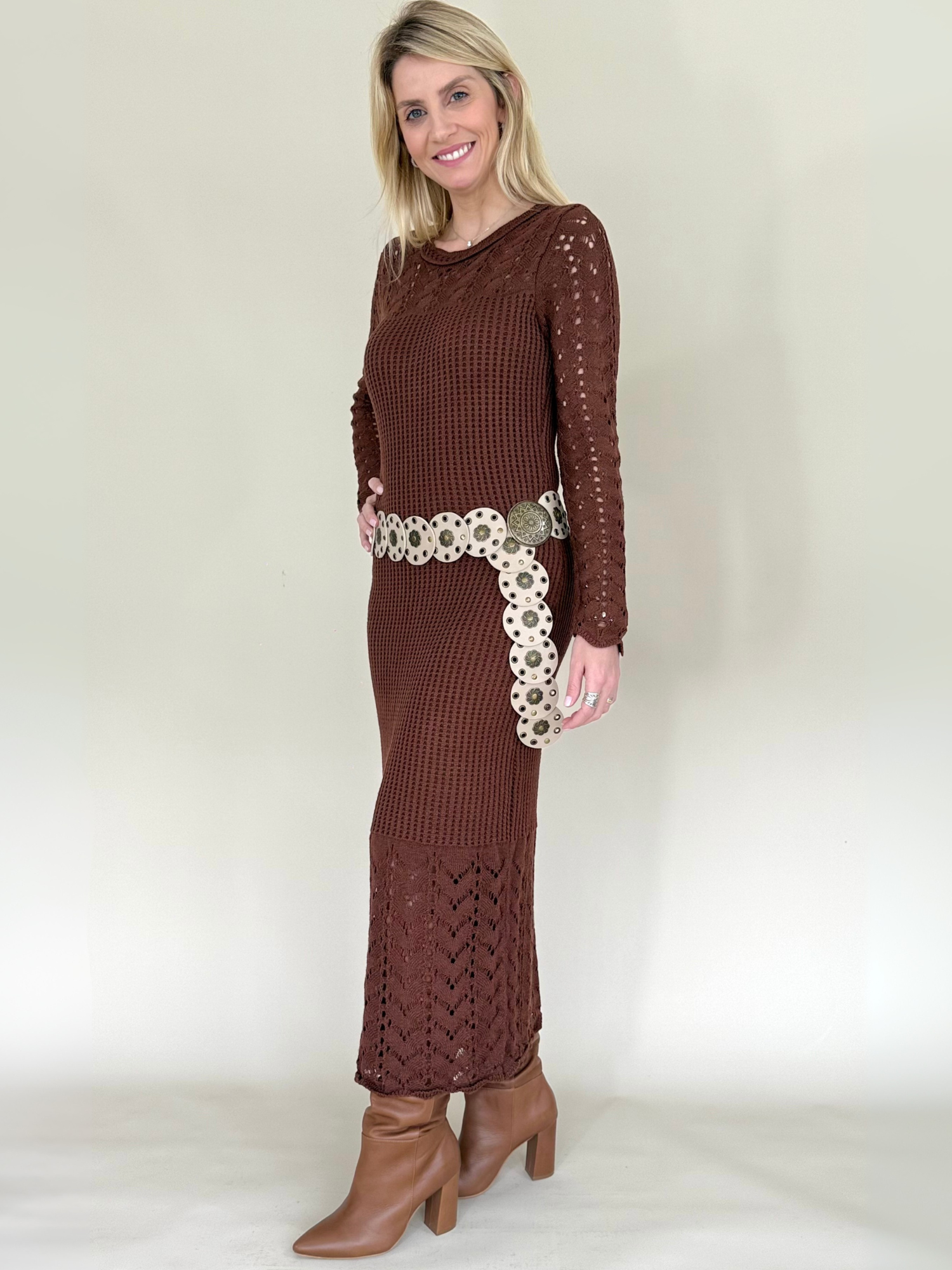 Vestido largo de tejido en punto mangas largas color café