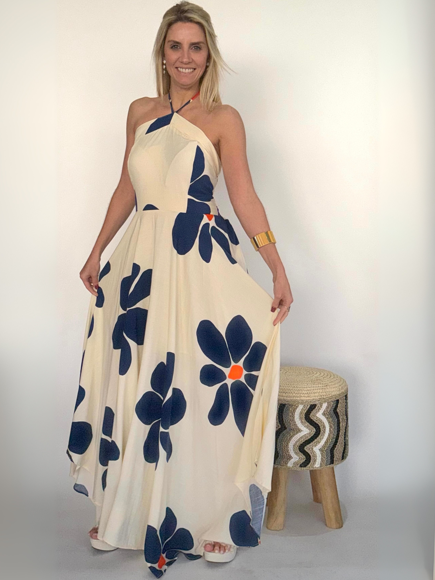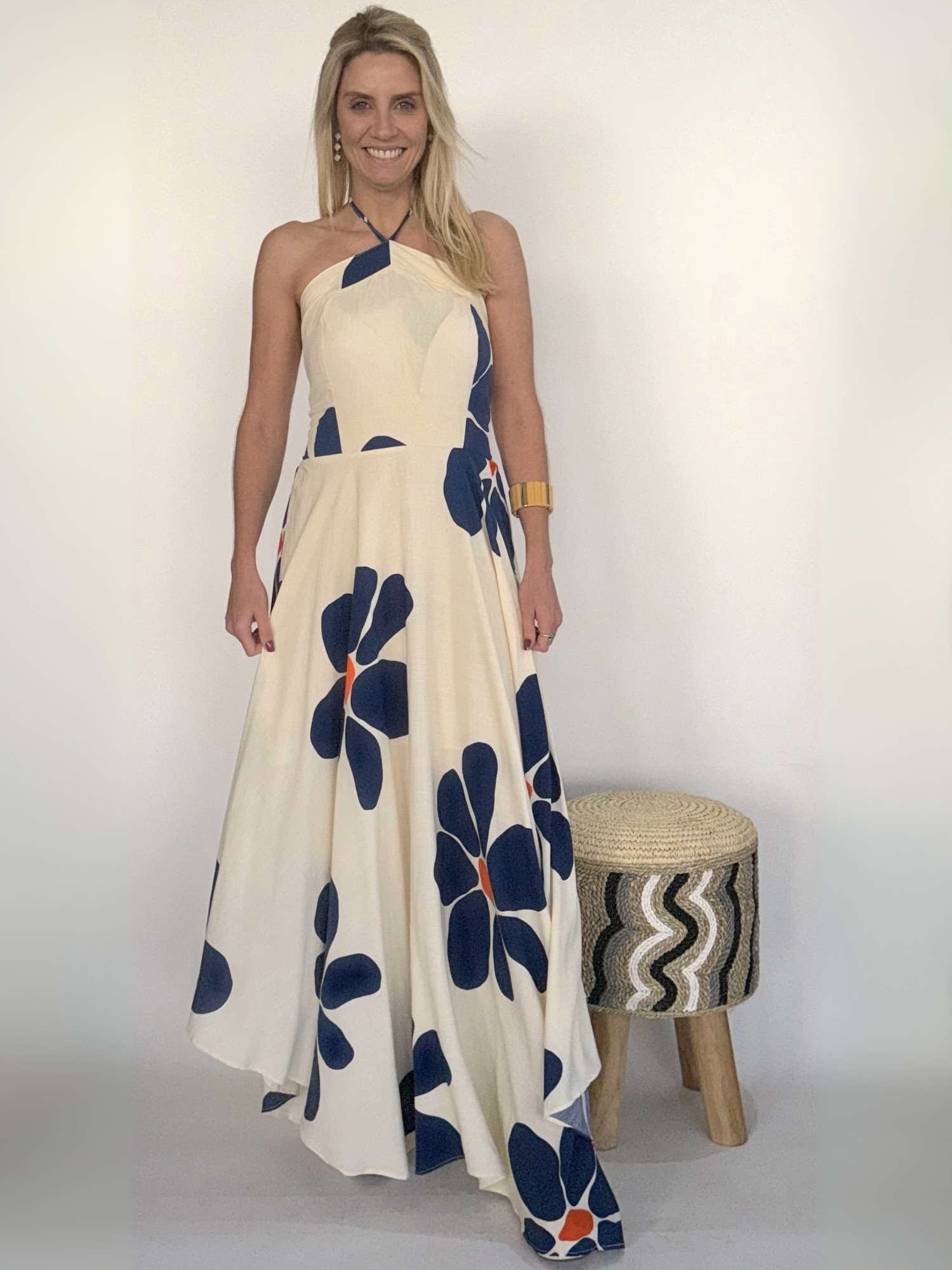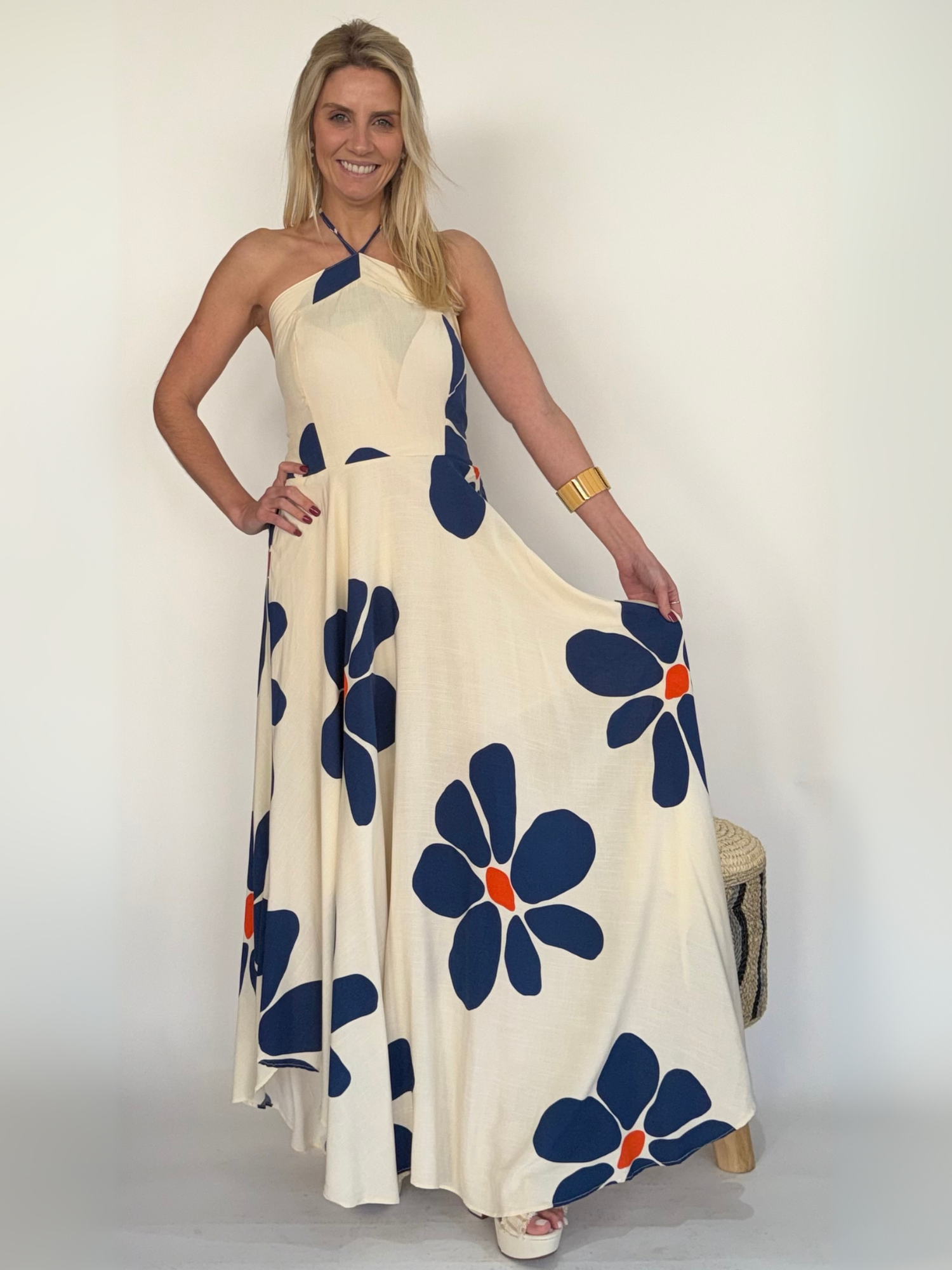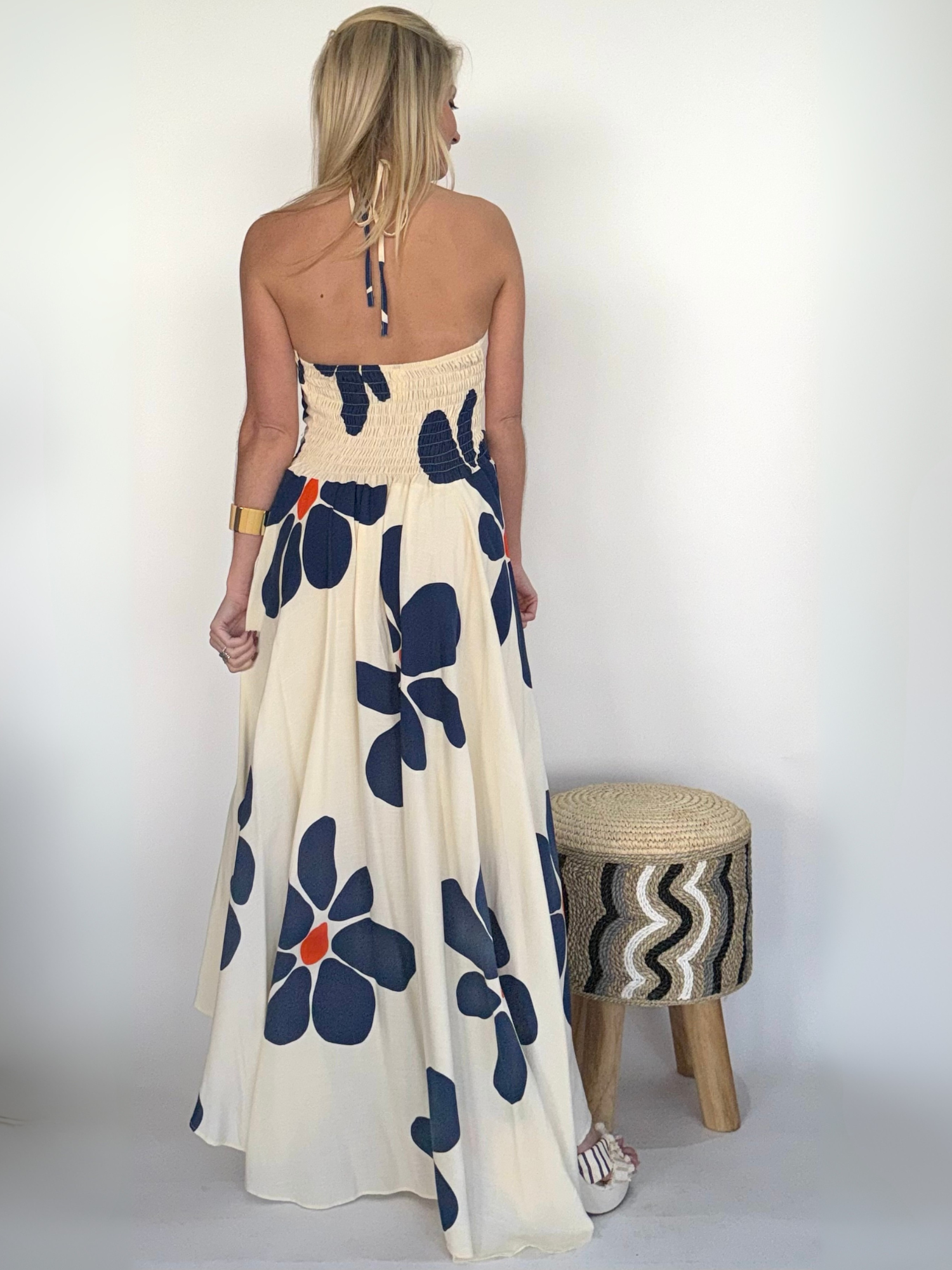 El Vestido largo sin hombros con tirantes al cuello es una pieza diseñada para resaltar la feminidad con frescura y sofisticación. Su escote descubierto realza los hombros y el cuello con elegancia, mientras que los tirantes al cuello aportan un aire contemporáneo y refinado. El estampado floral añade un toque romántico y vibrante, haciendo de este vestido una prenda ideal para lucir en ocasiones especiales, tanto de día como de noche.